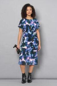 Pohodlné voľné šaty s bočným riasením z aktuálnej kolekcie talianskej módnej značky Rinasimento sú ležérnym, no štýlovým modelom. Šaty majú nádhernú farebnosť s abstraktným grafickým vzorom, perfektný strih z príjemného materiálu, okrúhly dekolt s raglanovým rukávom, lady dĺžku s bočným rozparkom a zadné zapínanie na zips. Kúsok ktorý sa hodí k teniskám aj lodičkám.