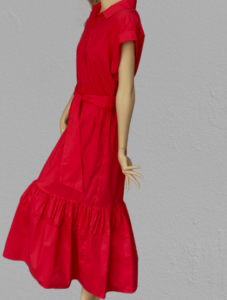 Letné šaty v malinovej červenej farbe z aktuálnej kolekcie talianskej módnej značky Rinascimento sú športovo – elegantným modelom vhodným na denné nosenie. Šaty majú košeľový vrchný diel, pružnú pásovku so širokým riaseným opaskom, rozšírenú sukňovú časť s riasením a volánom, spadnutý rukáv ukončený manžetou a veľmi príjemný prírodný materiál.