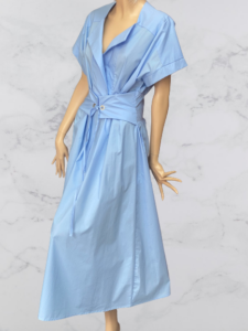 Letné šaty v príjemnom modrom farebnom odtieni z aktuálnej kolekcie luxusnej talianskej značky Rinascimento sú pekným letným modelom ušitým z príjemného prírodného materiálu. Šaty majú prekrížený dekolt, pružnú pásovku, 3/4 riasený rukáv ukončený stiahnutím do gumy a asymetricky ukladané volány v sukňovej časti.