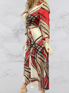 Luxusné košeľové šaty z aktuálnej kolekcie talianskej módnej značky Rinascimento sú nádherným modelom na štýlové denné nosenie. Šaty majú prestrih v páse s opaskom, zapínanie na malé gombíky v zlatej farbe, 3/4 rukáv ukončený manžetou, podšitie, veľmi peknú farebnosť s geometrickým vzorom a príjemný materiál – syntetický hodváb.