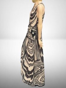 Talianska módna značka Rinascimento vo svojej novej kolekcii prináša eleganciu, nespútanosť, jedinečnosť, originalitu, kvalitné materiály a úžasné kombinácie vzorov. Dôkazom toho sú aj tieto vzdušné šaty v asymetrickom strihu s nápaditým geometrickým vzorom v čierno – béžovej farebnej kombinácii. Šaty majú bočné zapínanie na zips, prekladaný dekolt, podšitie, riasenú širokú pásovku s prackou a bohatú sukňovú časť s volánom.