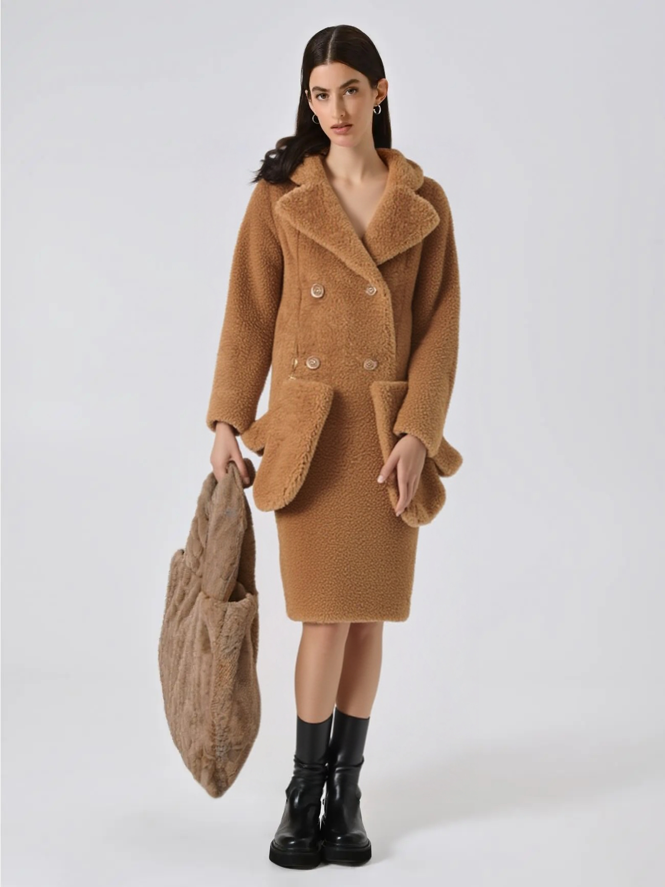 Dlhý kožušinový kabát – baránok , vyrobený z kvalitnej imitácie baranej kožušiny, je hrejivým, športovo – elegantným modelom z dielne talianskej módnej značky Rinascimento, vyznačujúcim sa praktickosťou a štýlom. Baránok má voľný, oversized strih so spadnutým rukávom a klasickou sakovou fazónkou, dve veľké bočné vrecká, dvojradové zapínanie na gombíky, neutrálny svetlohnedý farebný odtieň a rukavice na dlhej koženej šnúre.