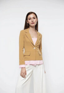 Skvelé sako z aktuálnej kolekcie talianskej módnej značky Rinascimento je mladistvým a ležérnym modelom vhodným na pohodlné denné nosenie. Sako je ušité z príjemného a vzdušného materiálu, má neutrálny svetlo – hnedý farebný odtieň, rovný strih, zapínanie na jeden gombík s logom značky, podšitie, dve falošné predné vrecká a nápadité, bielo ružové pruhované zakončenie spodných častí,