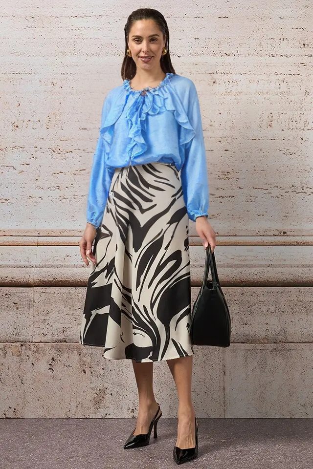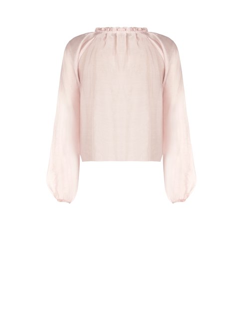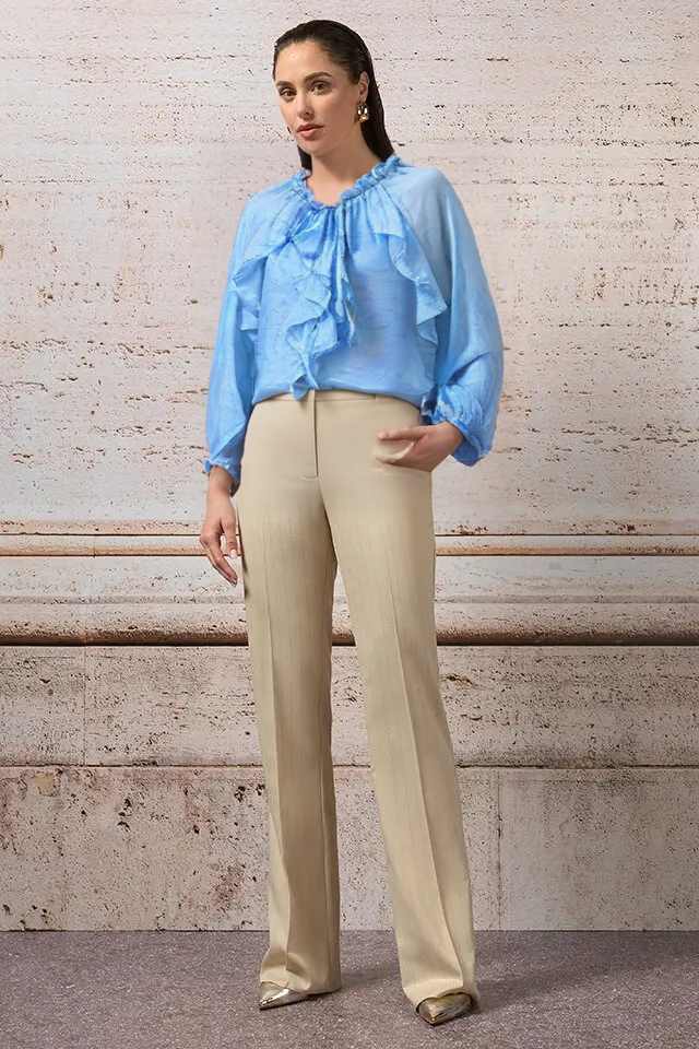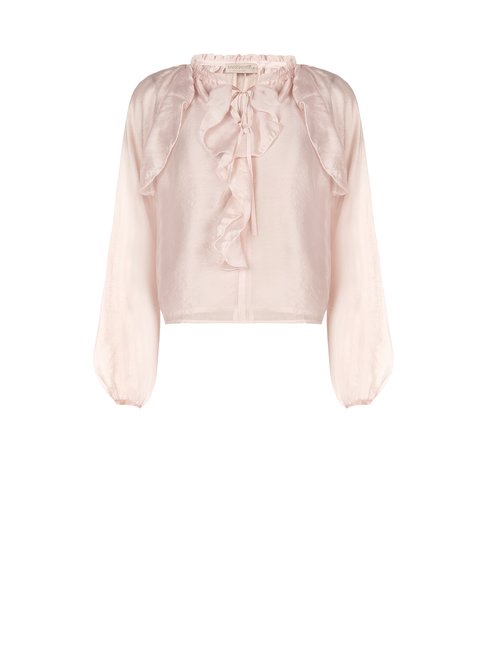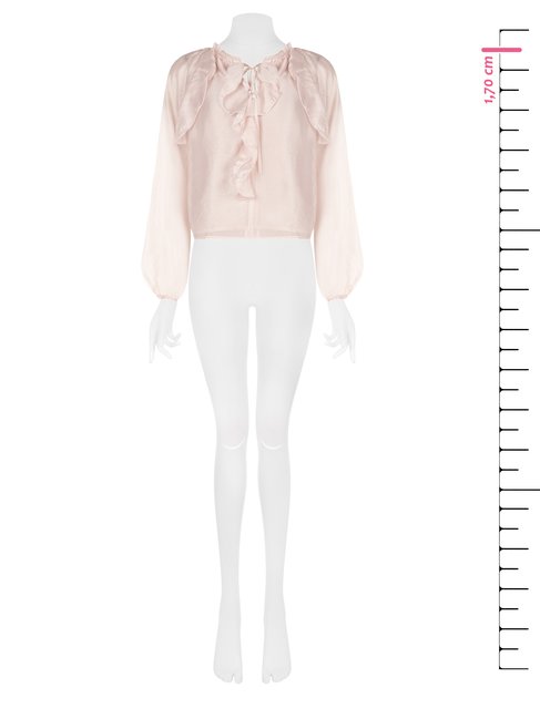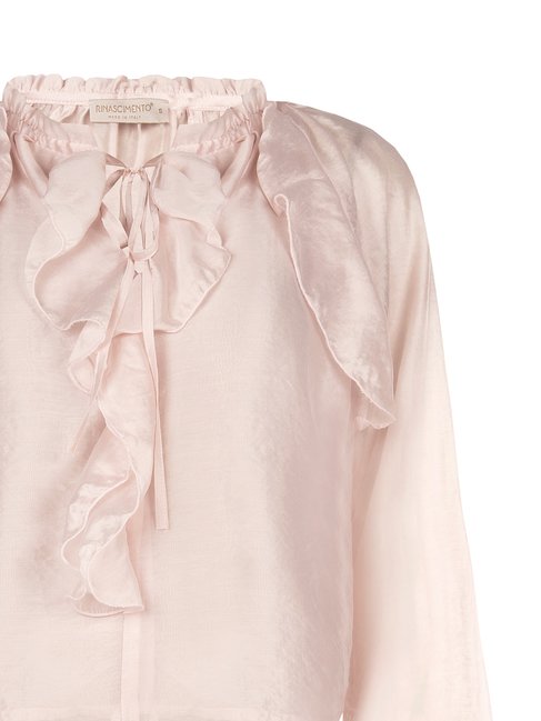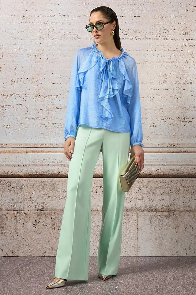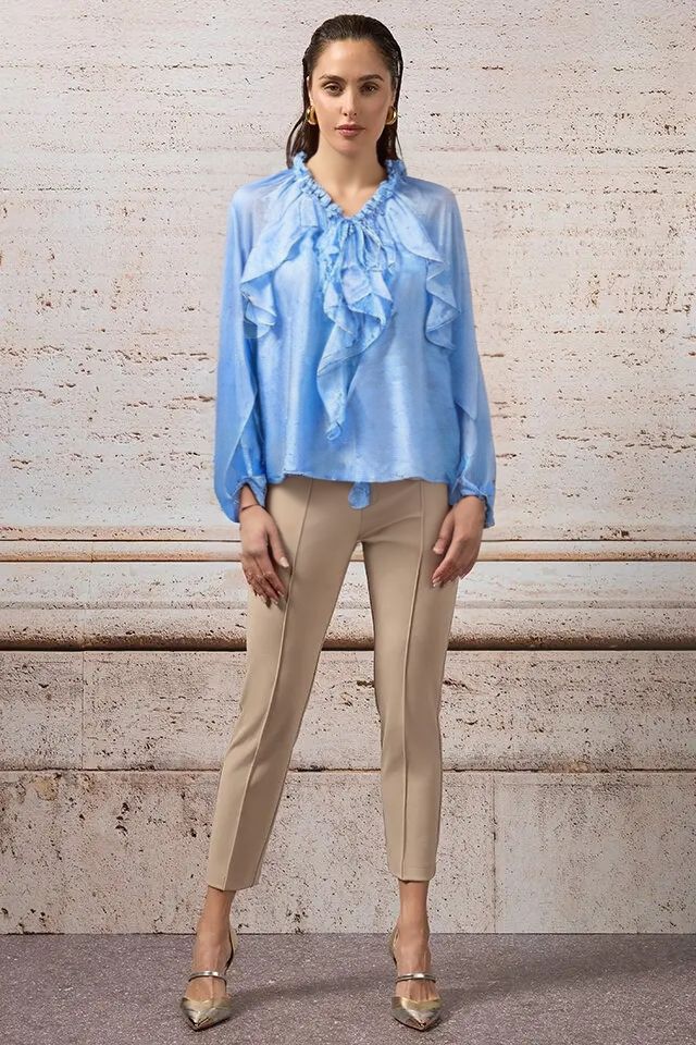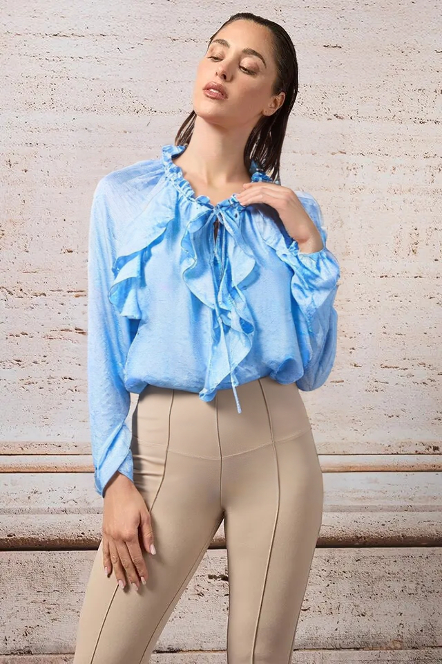 Túto blúzku z kolekcie talianskej módnej značky Rinascimento definuje vzdušný objem a nádherná nebesky modrá farba. Je vyrobená z kvalitného, mierne krčeného polyviskózneho materiálu, má romantický nádych vďaka volánom v prednej časti a stojačikovému golieriku, ktorý sa spája viazaním na stuhu. Voľný strih je doplnený raglanovým rukávom ukončeným tenkou manžetou a riasením. Predný diel modelu je je ušitý dvojmo.