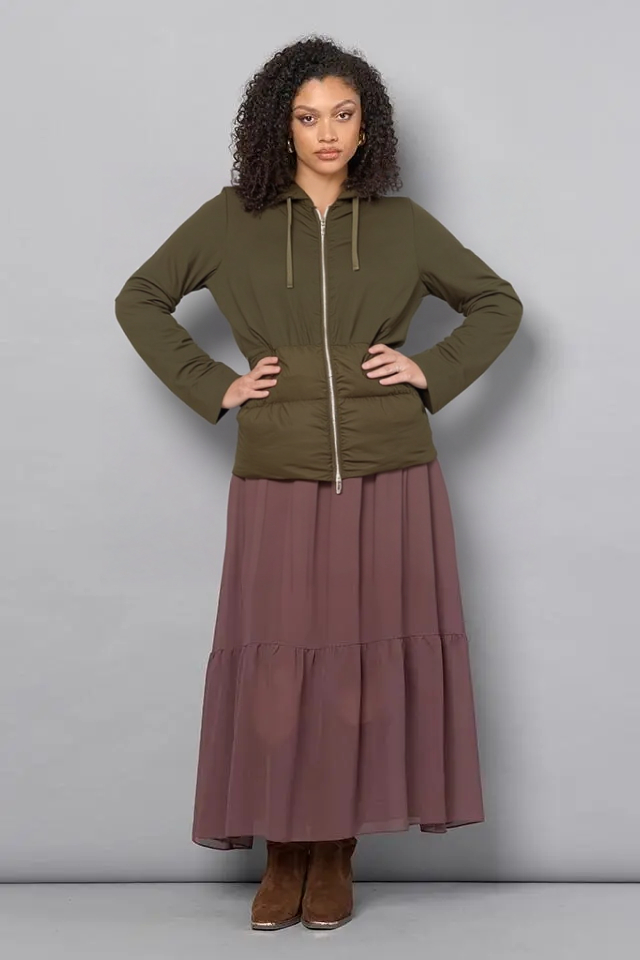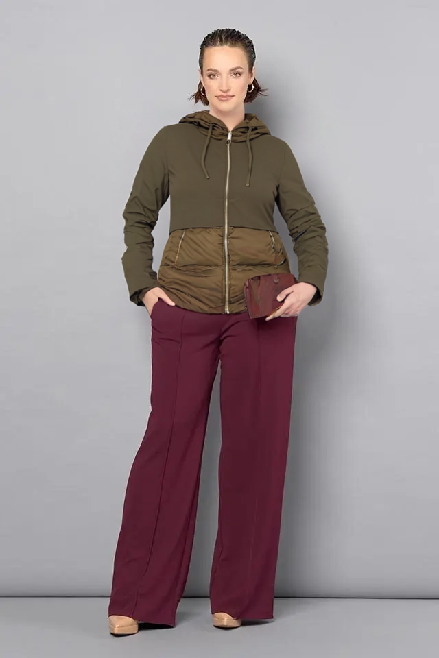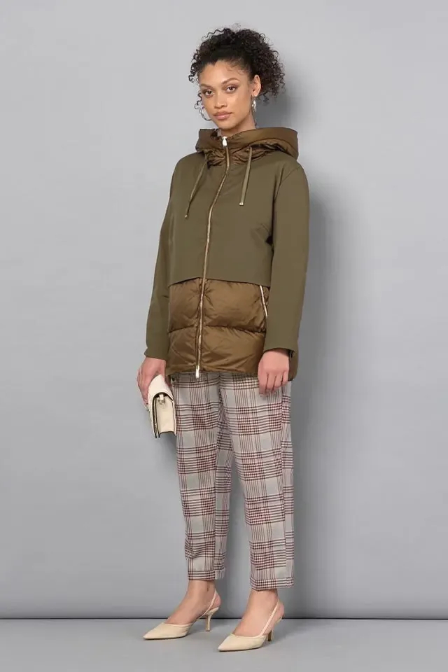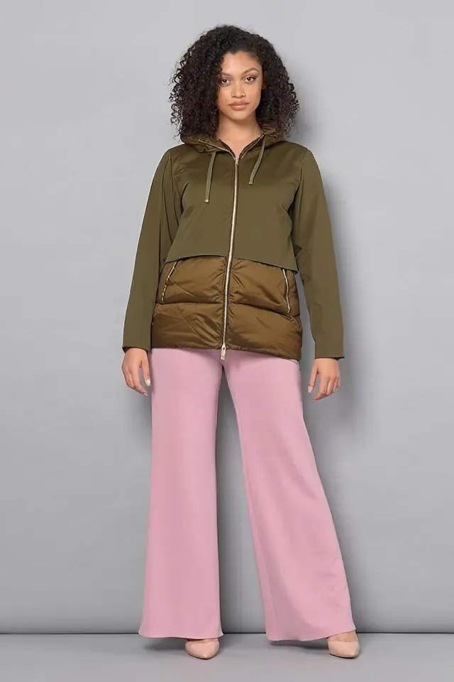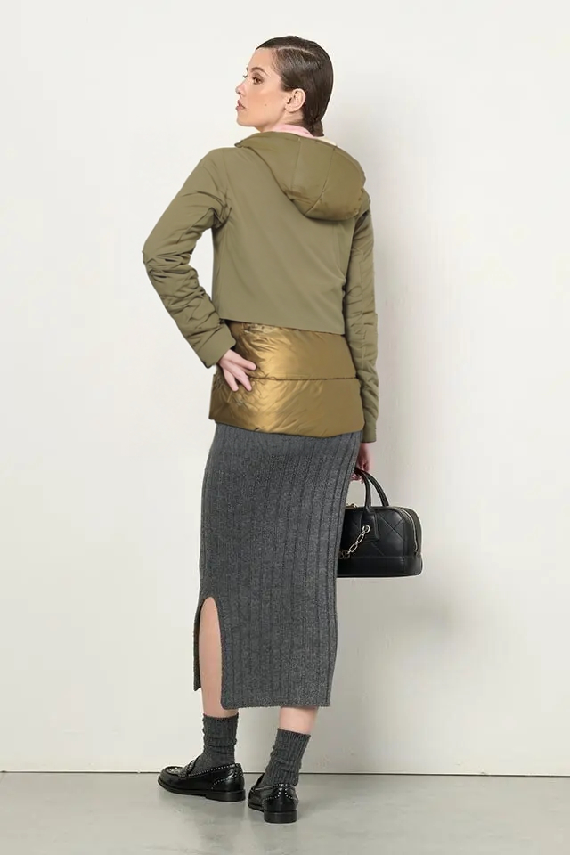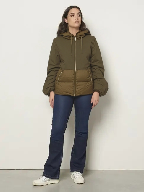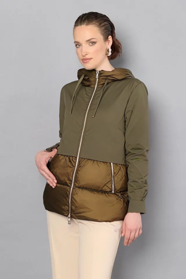 Nápaditá zimná bunda z kolekcie talianskej módnej značky Rinascimento je hrejivým športovo – elegantným modelom vhodným na denné nosenie. Bunda má zaujímavé kombinované šitie – lesklý a matný materiál v zelenom farebnom odtieni, kvalitné hrubé vatovanie, pošitie s monogramom, kapucňu, zapínanie na obojsmerný zlatý zips, možnosť stiahnutia v spodnej časti a na kapucni, ochranné úpletové manžety na rukávoch a dve bočné vrecká.