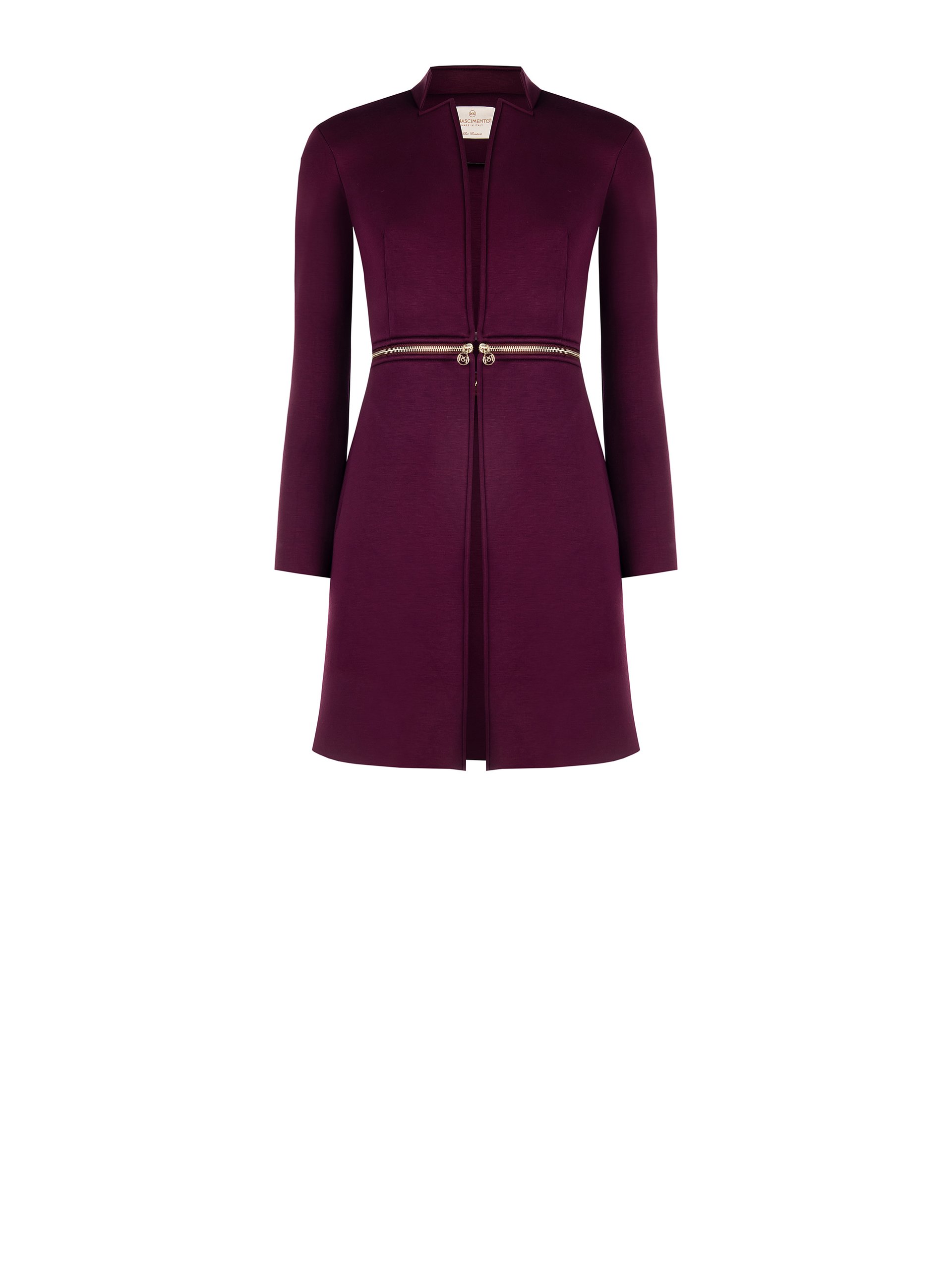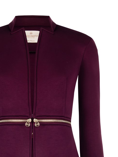 Skvelý prechodný kabát z kolekcie talianskej módnej značky Rinascimento je moderným a príťažlivým modelom vhodným na denné nosenie ako predĺžené sako, alebo ako bolerko. Je vyrobený z kvalitného pružného, polyviskózneho materiálu v peknom bordó farebnom odtieni. Má sakový tvarujúci strih nad kolená, pekné hladké línie s vypracovanou fazónkou, zapínanie na háčik, dve bočné vrecká a úžasný dekoratívny prvok – kontrastný zlatý zips s logom značky v pásovke, ktorého odzipsovaním sa mení dlhý kabát na krátky.