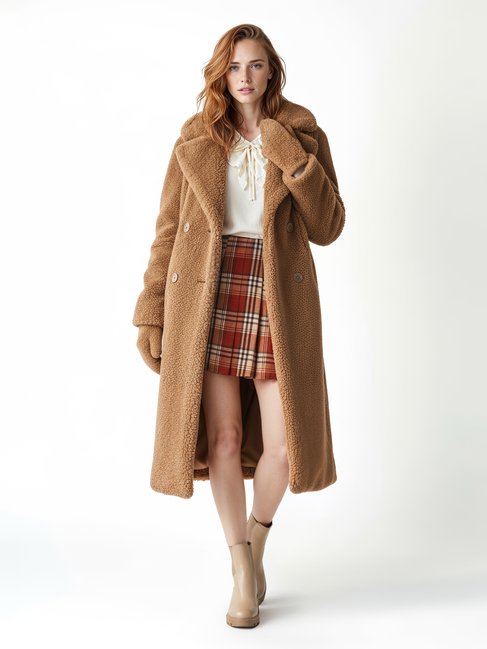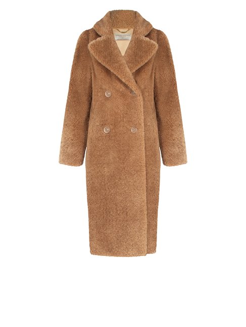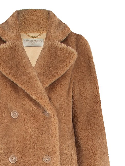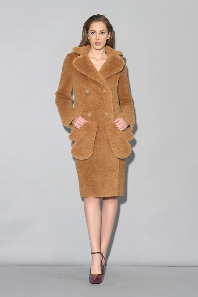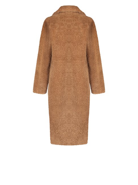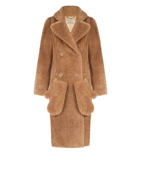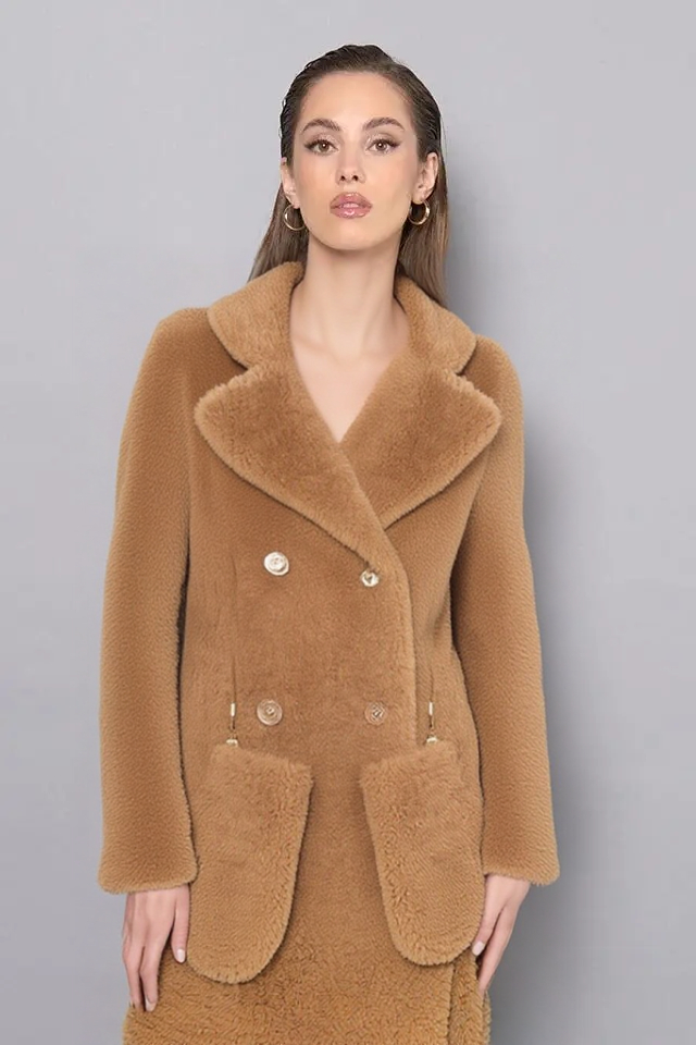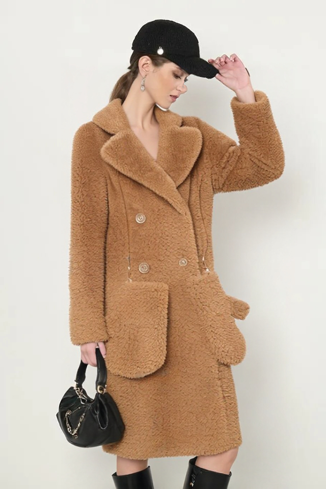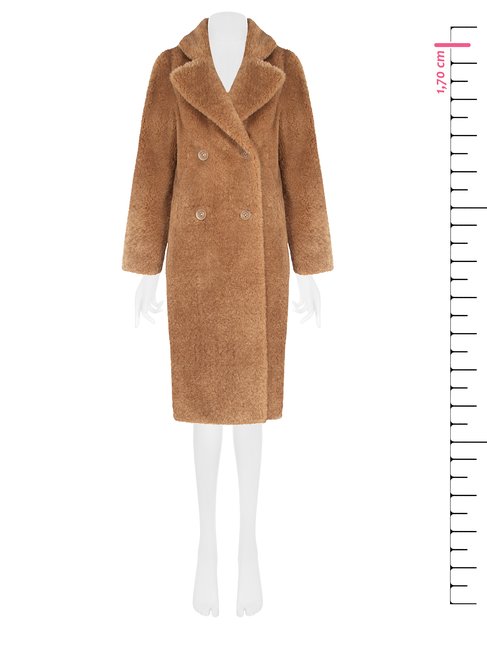 Dlhý kožušinový kabát – baránok , vyrobený z kvalitnej imitácie baranej kožušiny, je hrejivým, športovo – elegantným modelom z dielne talianskej módnej značky Rinascimento, vyznačujúcim sa praktickosťou a štýlom. Baránok má voľný, oversized strih so spadnutým rukávom a klasickou sakovou fazónkou, dve veľké bočné vrecká, dvojradové zapínanie na gombíky, neutrálny svetlohnedý farebný odtieň a rukavice na dlhej koženej šnúre.