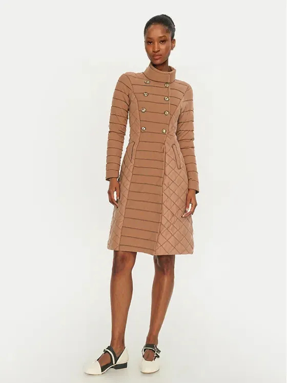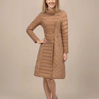 Svetlohnedý prešívaný kabát je štýlovým kúskom zimnej kolekcie talianskej módnej značky Rinascimento. Kabát má zaujímavý rozšírený strih, zapínanie na dvojsmerný zips a dvojradové zapínanie patentovými gombíkmi s logom značky, veľmi pekné ozdobné štepovanie a dve bočné vrecká. Model ktorý neprehliadnuteľný, nadčasový a pritom veľmi praktický.