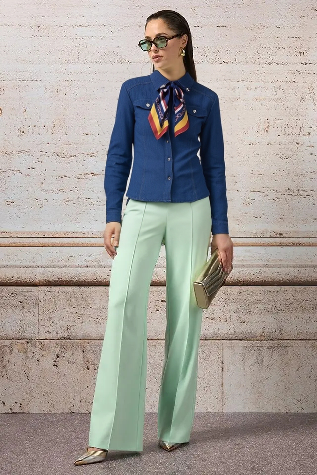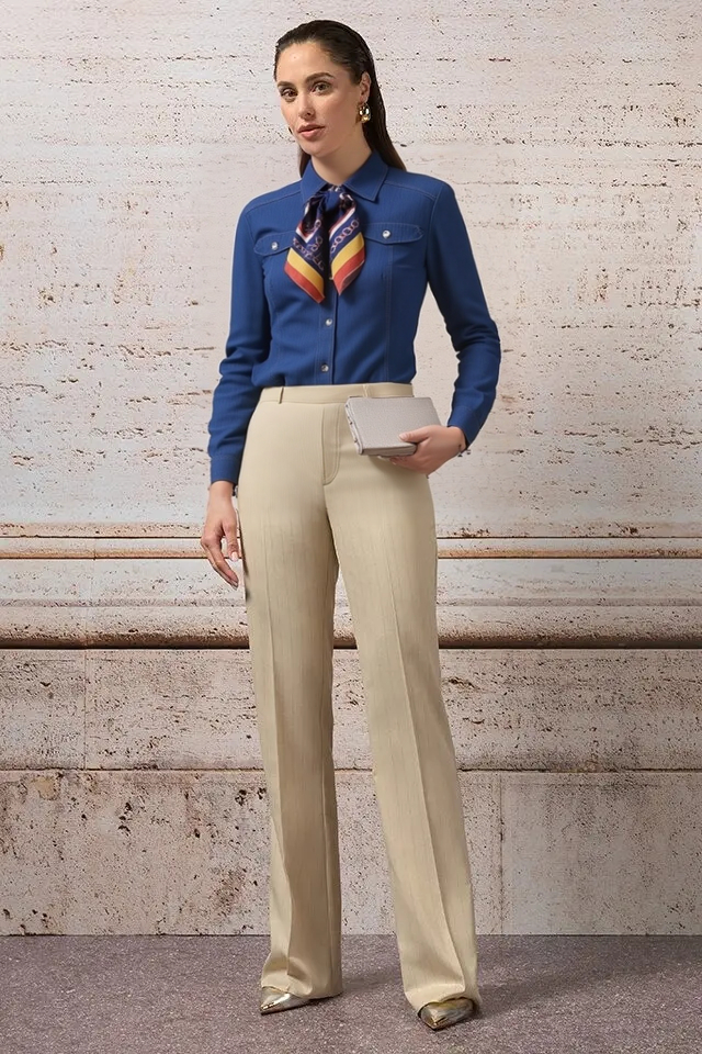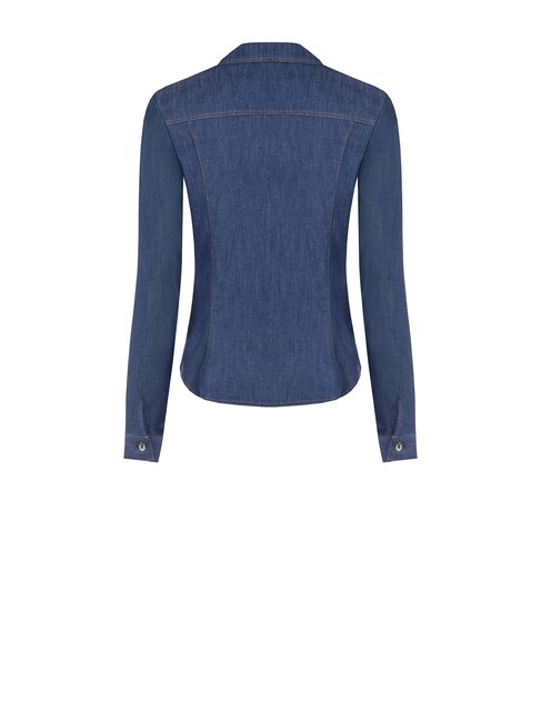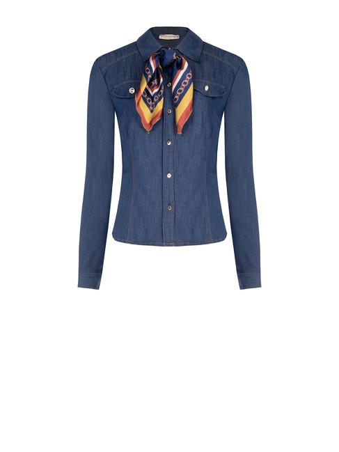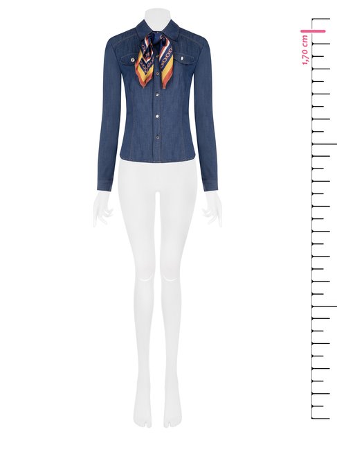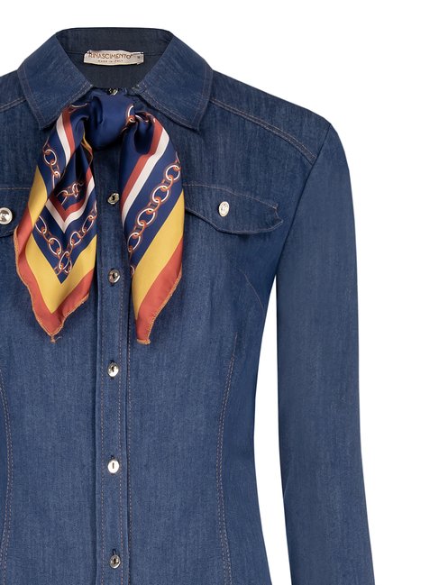 Vkusná letná košeľa z kolekcie talianskej módnej značky Rinascimento je ležérnym modelom vhodným na denné nosenie v teplejšom období. Košeľa je vyrobená z ľahkej bavlnenej látky v klasickom tmavomodrom farebnom odtieni, má klasický košeľový slim fit strih s pekným vypracovaním a dvomi falošnými vreckami, zapínanie na gombíky a kreatívny detail ktorý oživuje – uško, v ktorom je uviazaná odnímateľná šatka v zemitých tónoch. Kúsok vyzerá výborne v kombinácii s voľnými nohavicami, alebo sukňou.
