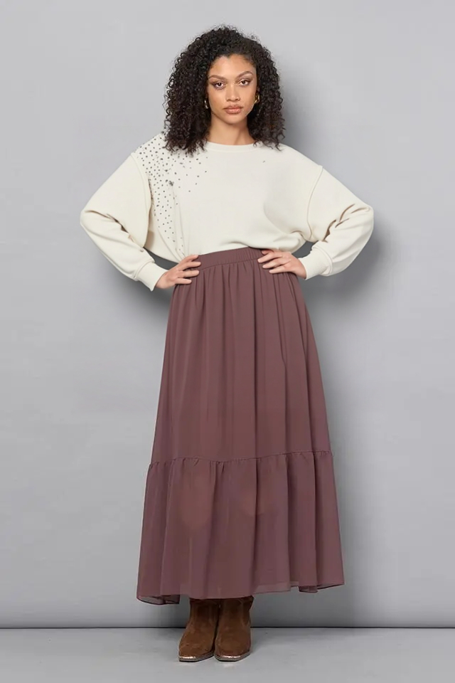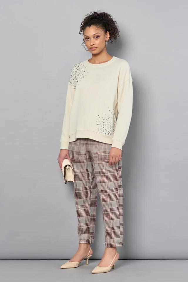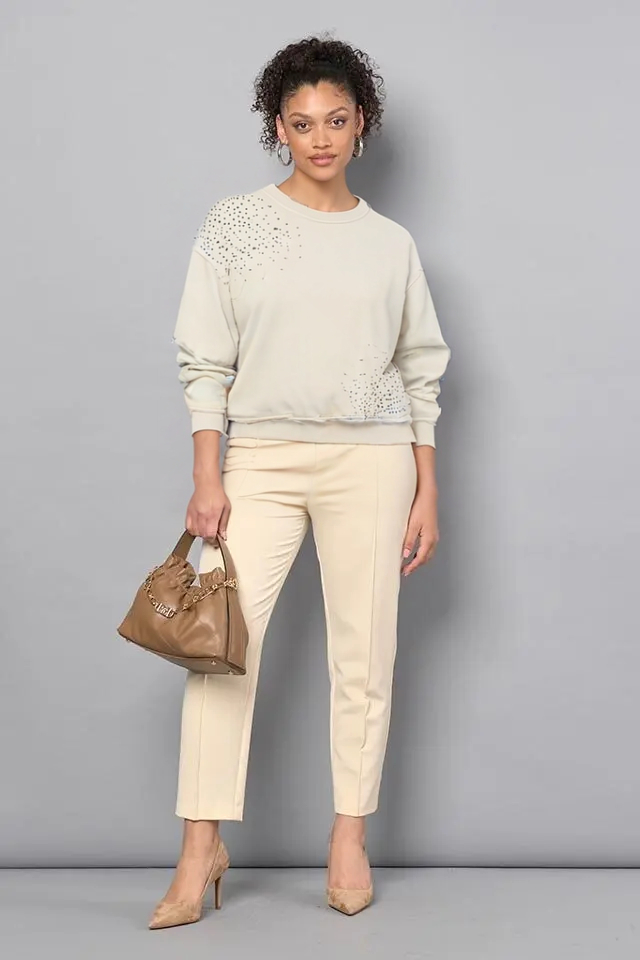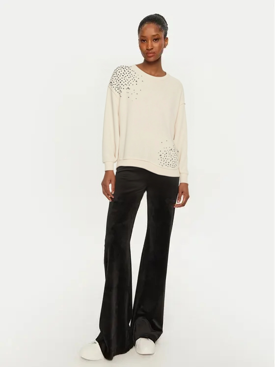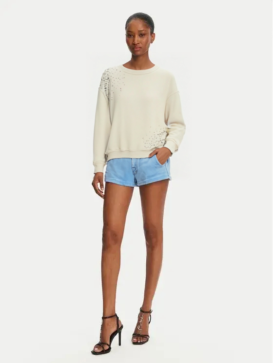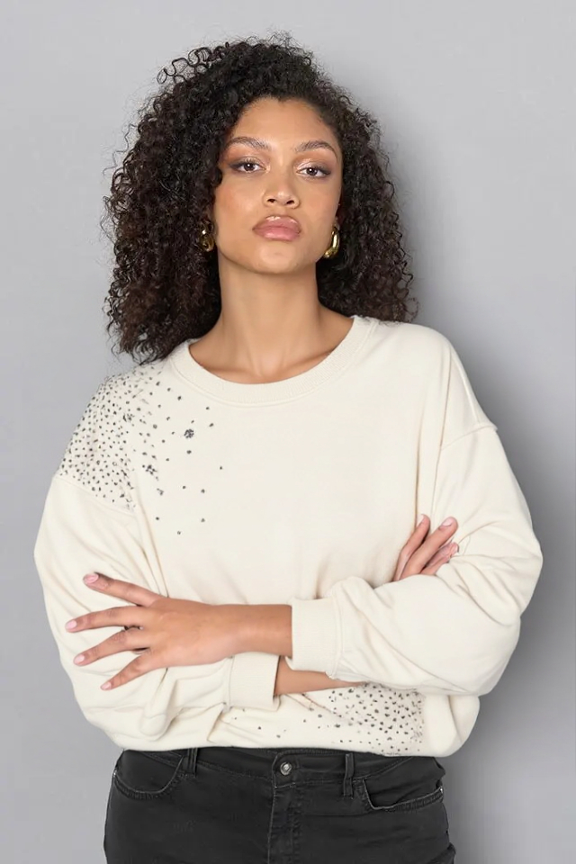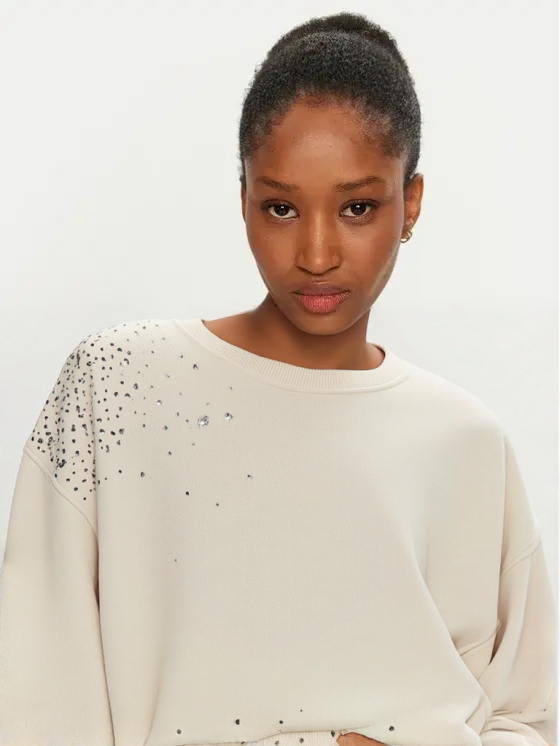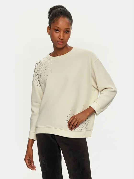 Mikina z kolekcie talianskej módnej značky Rinascimento je univerzálnym kúskom vhodným na každodenné nosenie, ktorý je ľahko kombinovateľný s nohavicami, sukňami aj rifľami. Mikina je vyrobená z kvalitnej bavlnenej zmesi v oversized strihu, má hladký mierne lesklý povrch, spadnutý rukáv, patentové ukončenia a štýlovo kamienkami zdobené rameno a bok.