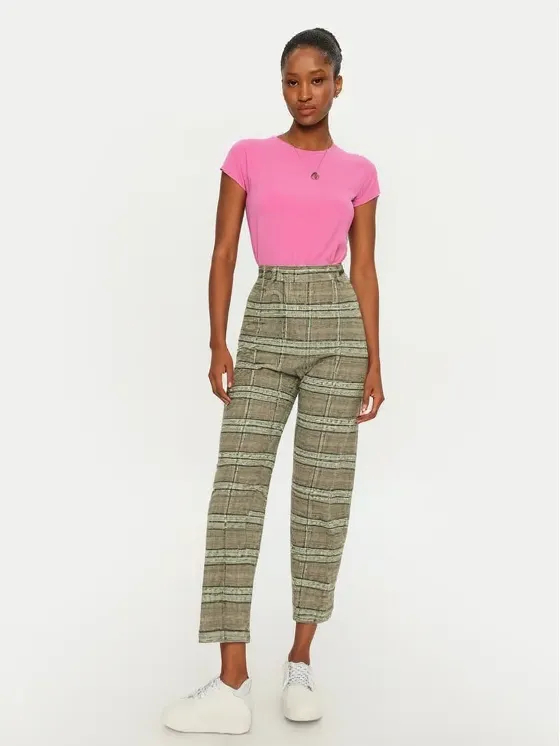 Voľné 7/8 nohavice s pekným káro vzorom so základom v zeleno – hnedom tóne sú modelom z aktuálnej kolekcie luxusnej talianskej značky Rinascimento. Nohavice majú pružnú, širokú pásovku, vyšší pás, dve bočné vrecká a zadné zapínanie na zips. Nohavice sú ušité z príjemného vzdušného materiálu a hodia sa na nosenie k lodičkám aj teniskám.