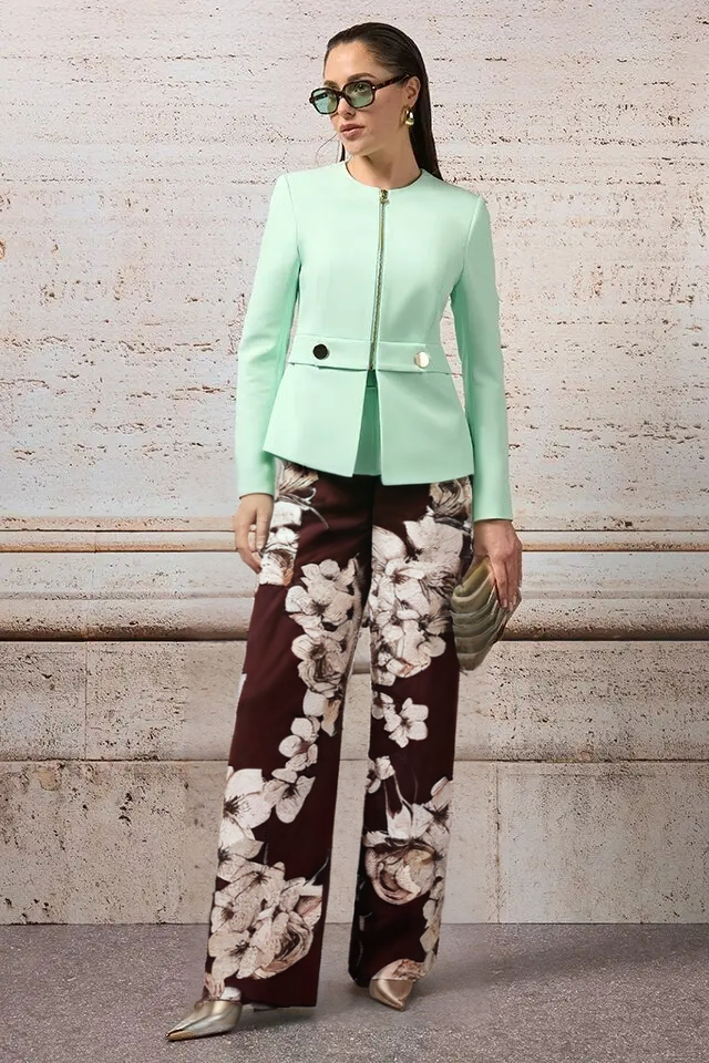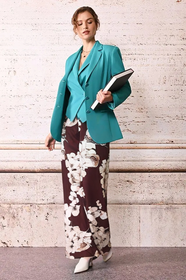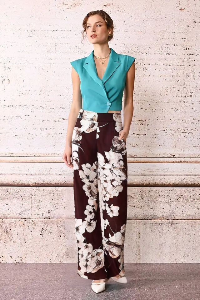 Jemnosť saténu letných palazzo nohavíc z kolekcie talianskej módnej značky Rinascimento sa stretáva s explóziou kvetov orchideí. Strih je navrhnutý tak, aby zvýraznil siluetu s ľahkosťou a nádychom farby – dominuje čokoládový hnedý základ na ktorom sú kvety svetlých tónov od bielej, cez smotanovú, zelenú až hnedú. Nohavice majú klasickú výšku pása so širšou pásovkou, jemné zámiky ktoré prechádzajú do širokých nohavicových dielov, podšitie a bočné zapínanie na zips.