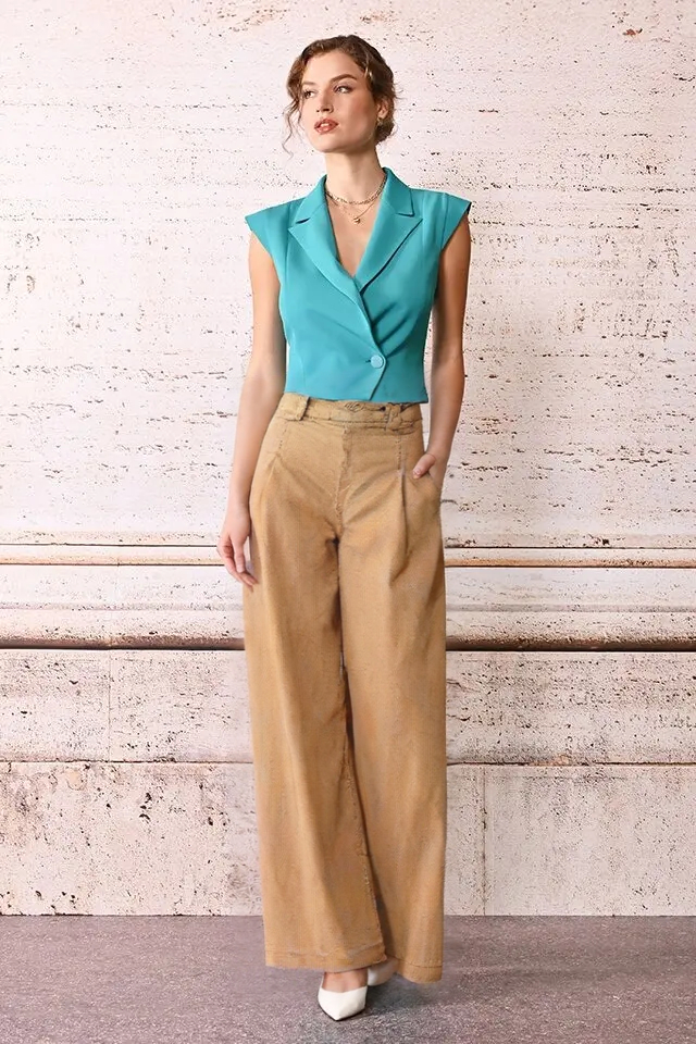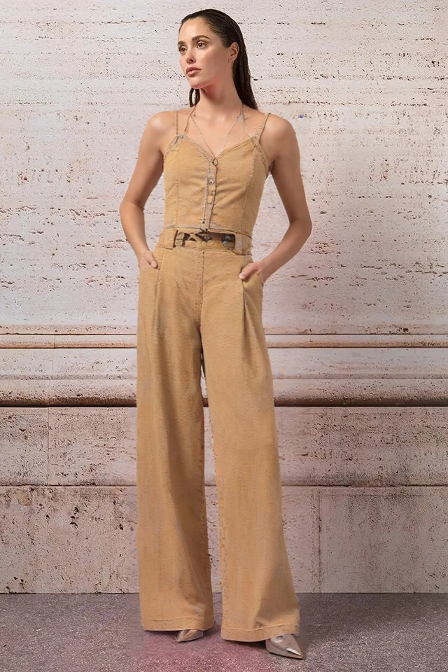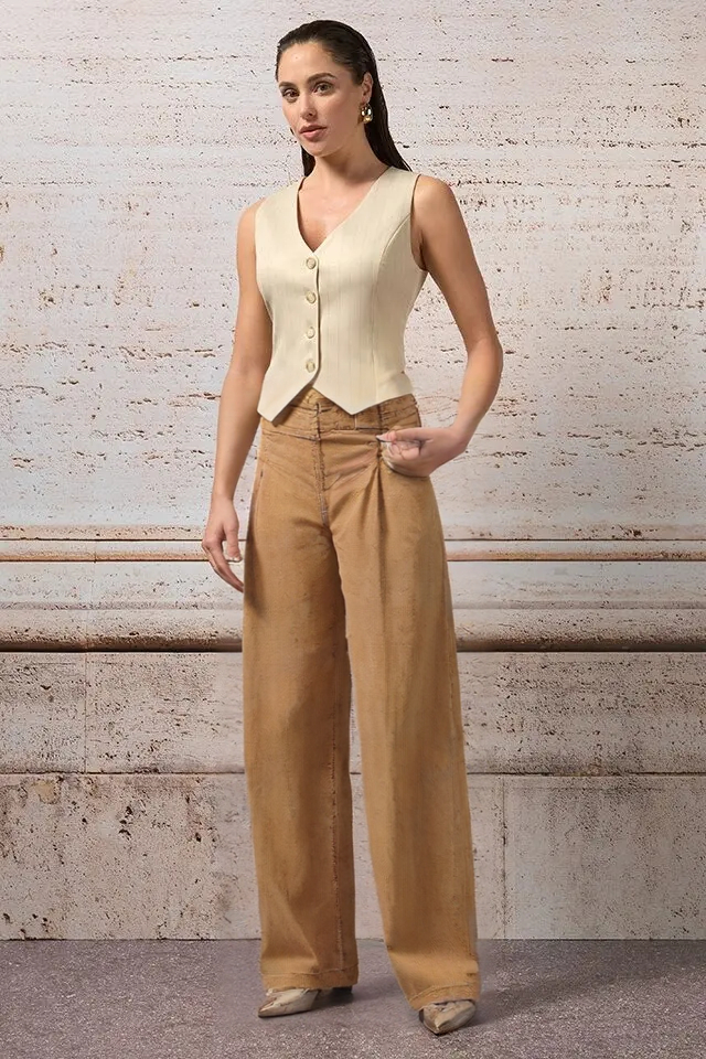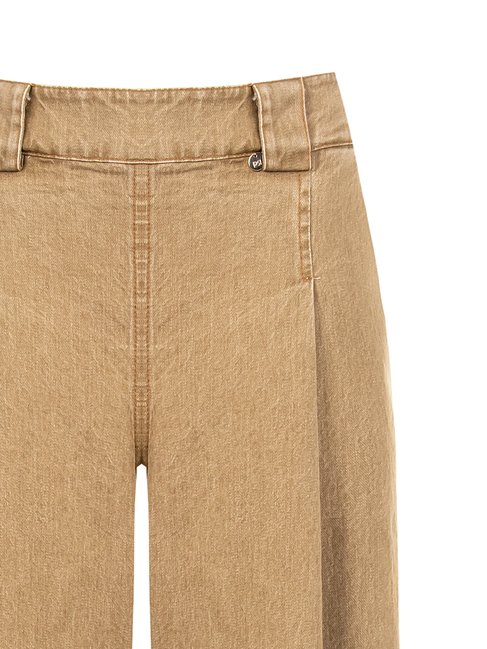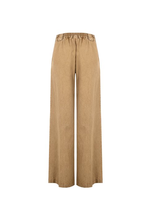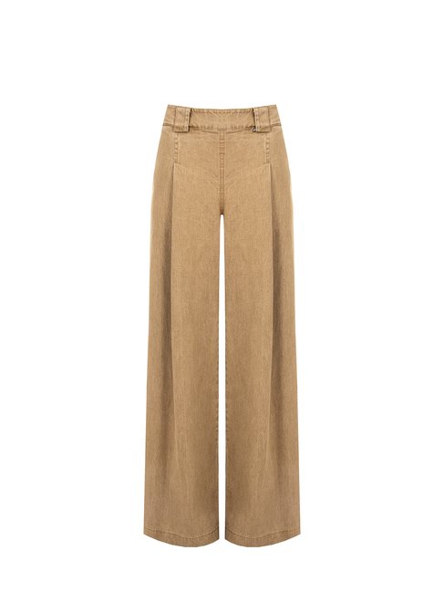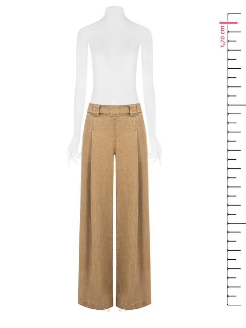 Nenútená elegancia svetlo hnedého, ľahkého denimu vyniká v modernej siluete palazzo džínsov z kolekcie talianskej módnej značky Rinascimento. Tieto džínsy ponúkajú svieži pohľad na klasiku v šatníku vďaka širokému, plynulému strihu. Tento model s klasickou výškou pásovky s pútkami na opasok, ktorá je v zadnej časti pružná sa vyznačuje prednými, od stehien vypustenými záhybmi so širokými nohavicami, čo opticky predlžuje postavu a dvomi ležérnymi bočnými vreckami. Sú kombinovateľné s ľahkými blúzkami, úpletmi alebo vestou.