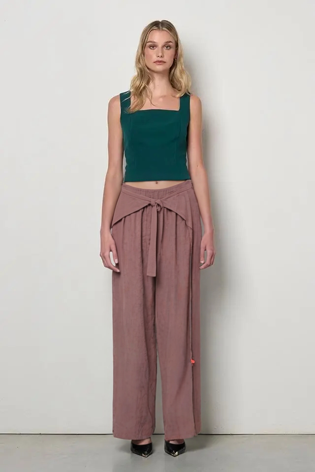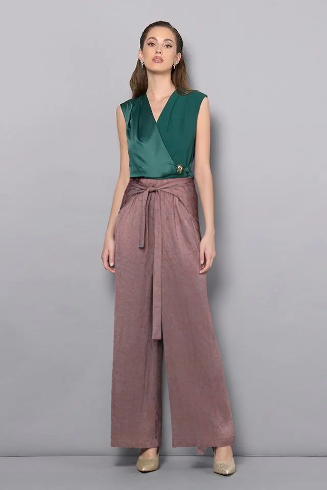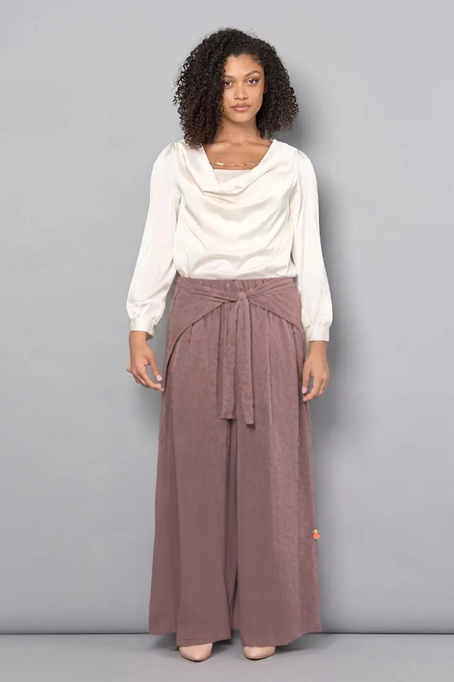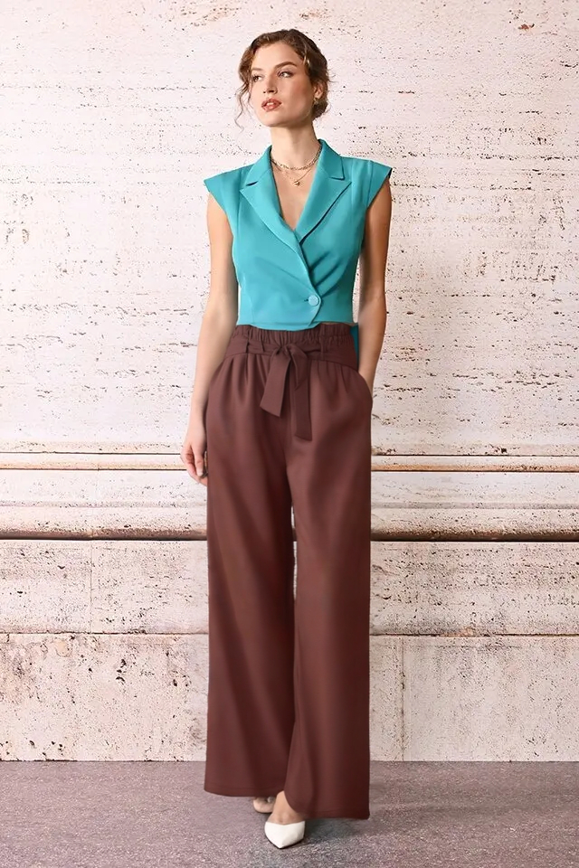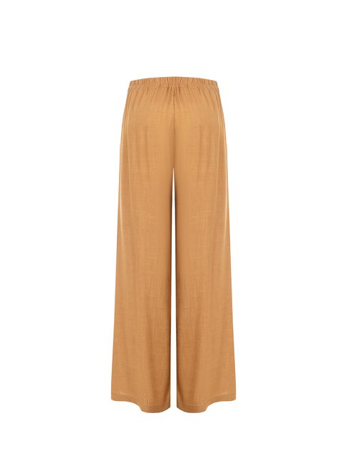 Plynulosť a štruktúra sa stretávajú v týchto hnedých palazzo nohaviciach z kolekcie talianskej módnej značky Rinascimento, kúsku navrhnutom pre štýlovú všestrannosť počas celého dňa. Nohavice sú vyrobené z kvalitného prírodného materiálu, ktorý zaručuje mäkké splývanie a dlhotrvajúce pohodlie, tento model lichotí siluete vďaka vysokému pružnému pásu, nápaditej viazačke a širokým, splývavým nohaviciam. Vďaka neutrálnemu odtieňu sú všestranným základom šatníka, ktorý sa ľahko kombinuje so základnými farbami aj s živšími odtieňmi.