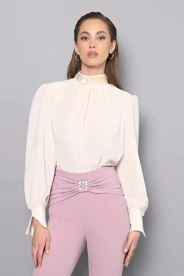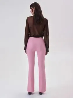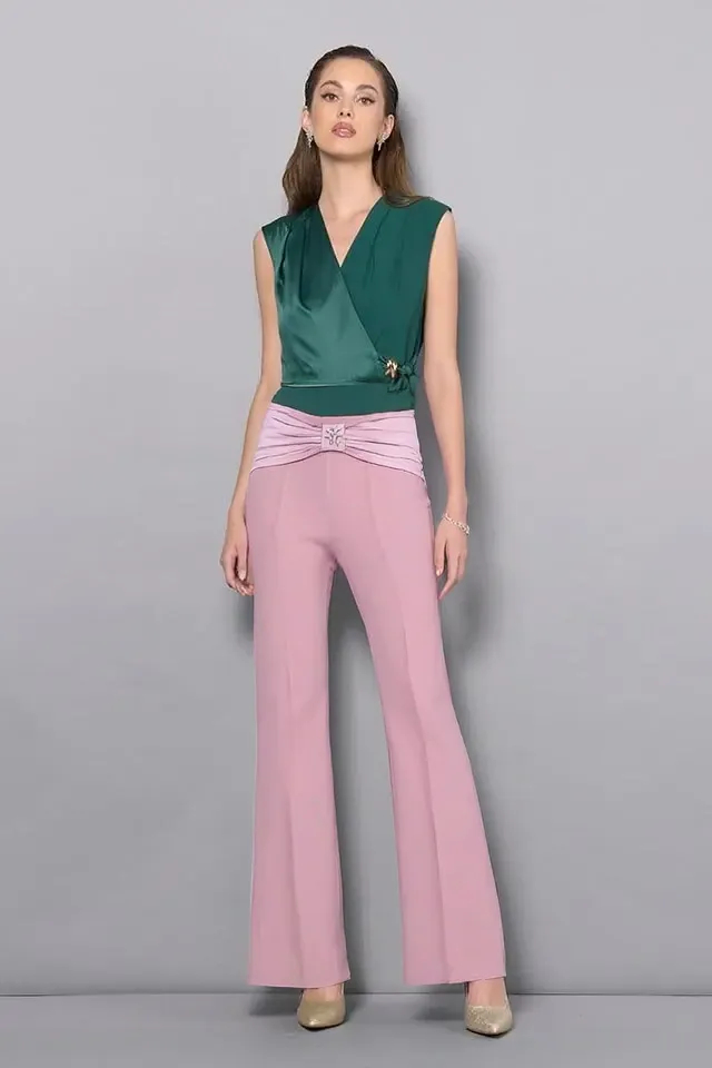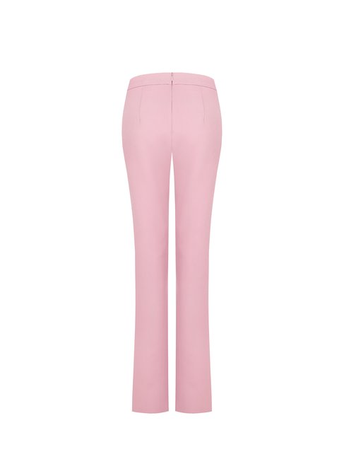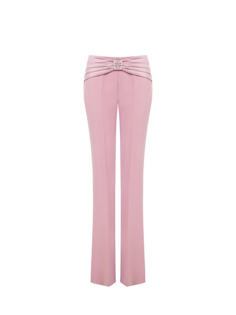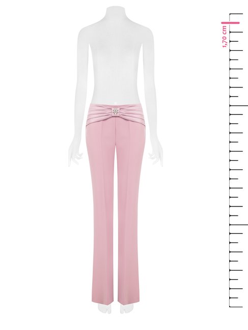 Luxusné nohavice z kolekcie talianskej módnej značky Rinascimento sú elegantným modelom vhodným tak na štýlové denné nosenie, ako aj na malé spoločenské udalosti. Nohavice sú vyrobené z kvalitného pružného materiálu, majú strednú výšku pásovky, zadné zapínanie na zips, mierne rozšírený strih, nádhernú fialovo ružovú farbu a skladanú asymetrickú saténovú ozdobnú pásovku s kryštálmi.