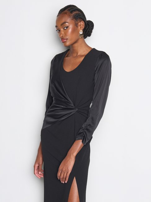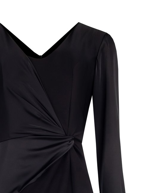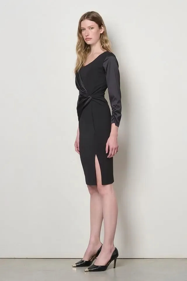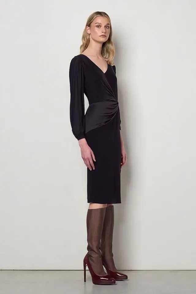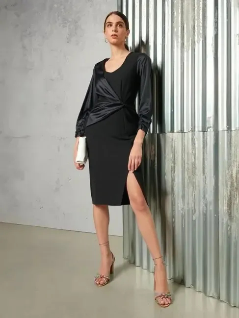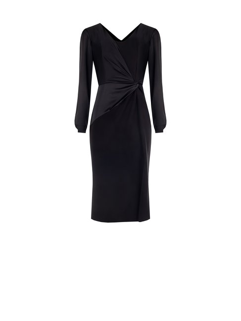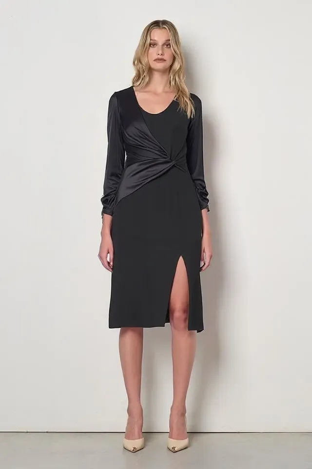 Puzdrové šaty z kolekcie talianskej módnej značky Rinascimento sú štýlovým a sofistikovaným modelom. Koktailové šaty sú vyrobené z kvalitných kombinovaných materiálov, majú okrúhly dekolt, zadné zapínanie na zips, nápadité saténové vloženie v uzle predného dielu a na rukávoch, ktoré sú v spodnej časti riasené a bočný predný rozparok. Kúsok opticky zoštíhľuje a predlžuje postavu.