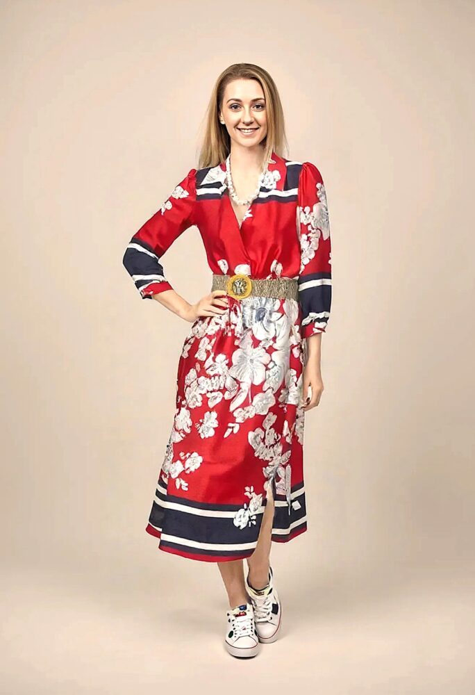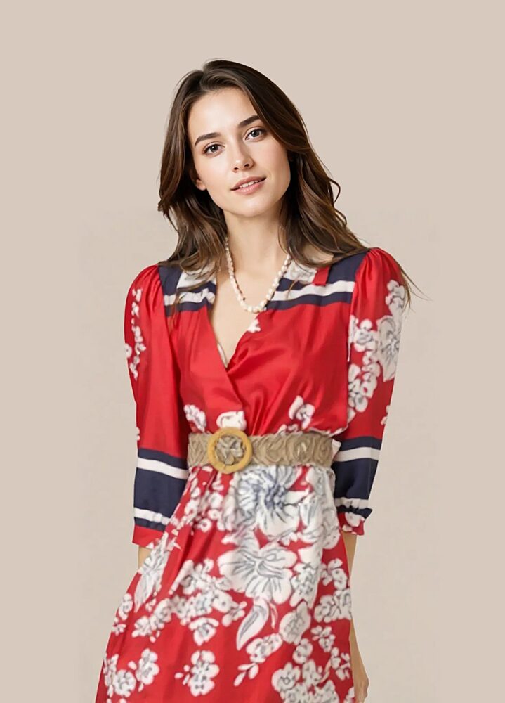 Roztomilé šaty z aktuálnej kolekcie talianskej módnej značky Rinascimento sú modelom príjemným na pohľad aj na nosenie. Šaty sú ušité so vzdušného materiálu, majú nádhernú “ námornícku “ farebnú kombináciu s kvetinovým vzorom, pružnú pásovku s opaskom, košeľovo riešený vrchný diel, 3/4 riasený rukáv ukončený manžetou a rozšírenú sukňovú časť s bočnými rázporkami.