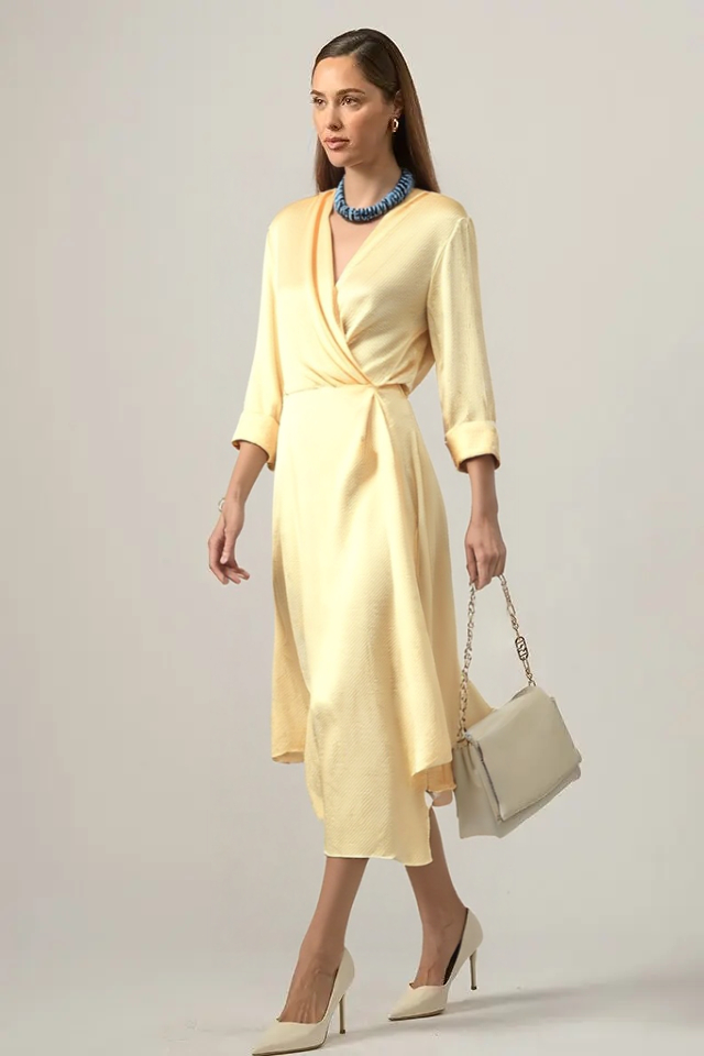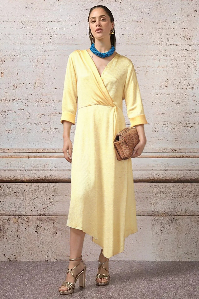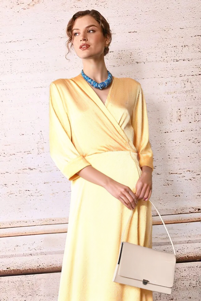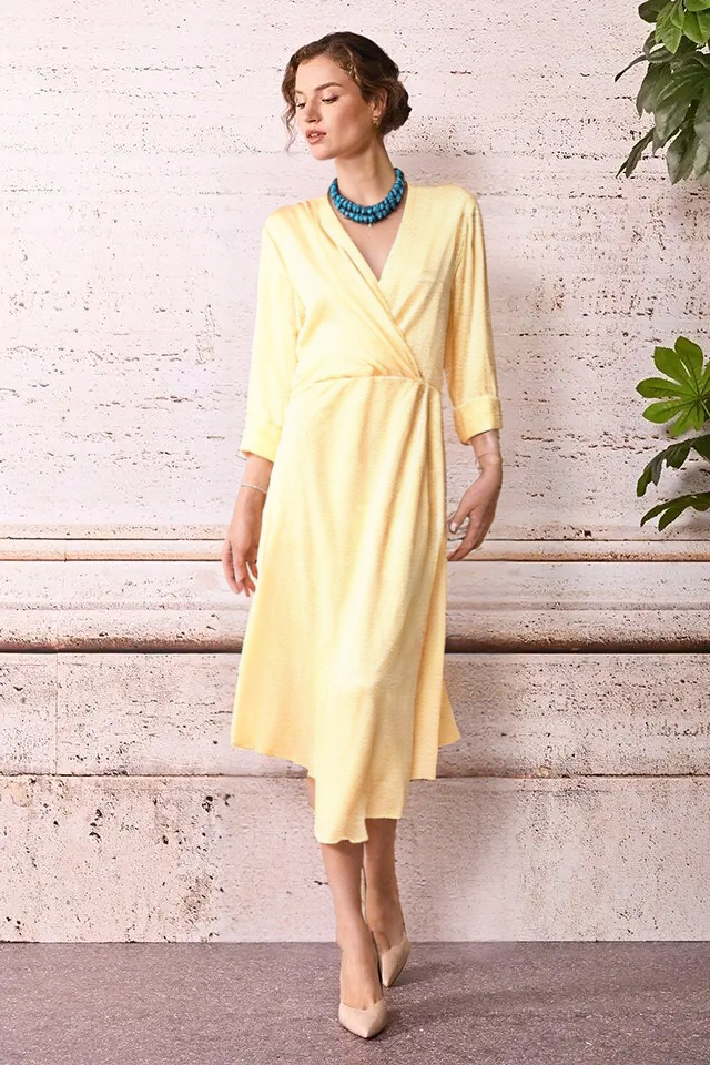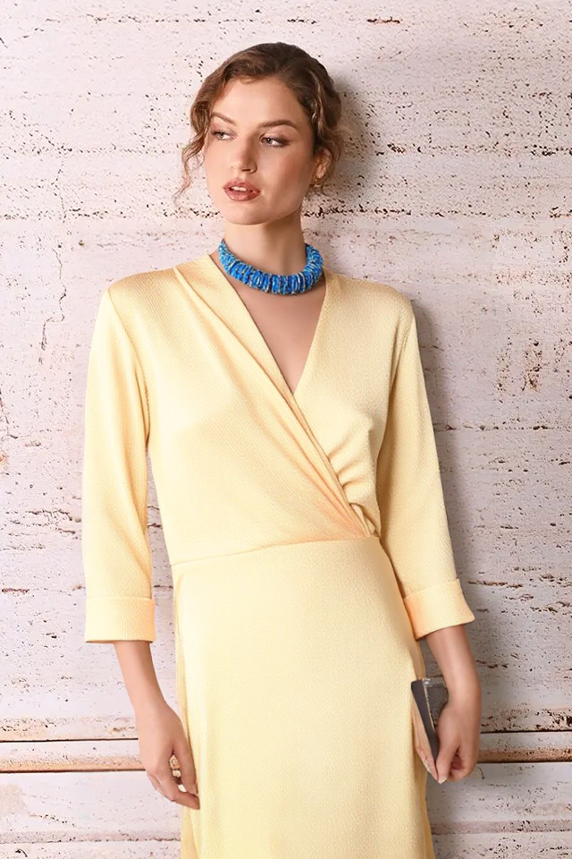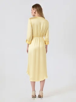 Elegantné šaty z kolekcie talianskej módnej značky Rinascimento sú vkusným kúskom vhodným na štýlové denné nosenie. Šaty sú vyrobené z krčeného, mierne lesklého saténového materiálu, majú nevtieravý žltý farebný odtieň, prekladaný dekolt s náznakom golierika na pravej strane, bočné zapínanie na zips, pružnú zadnú pásovku, 3/4 rukáv s manžetou a mierne riasenú, asymetrickú a rozšírenú sukňovú časť.