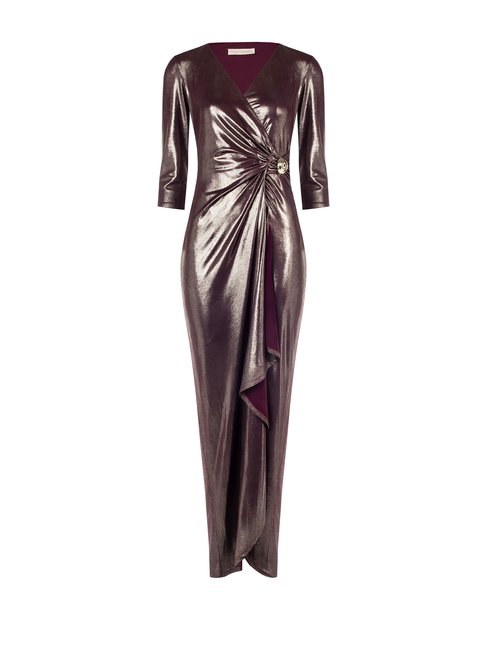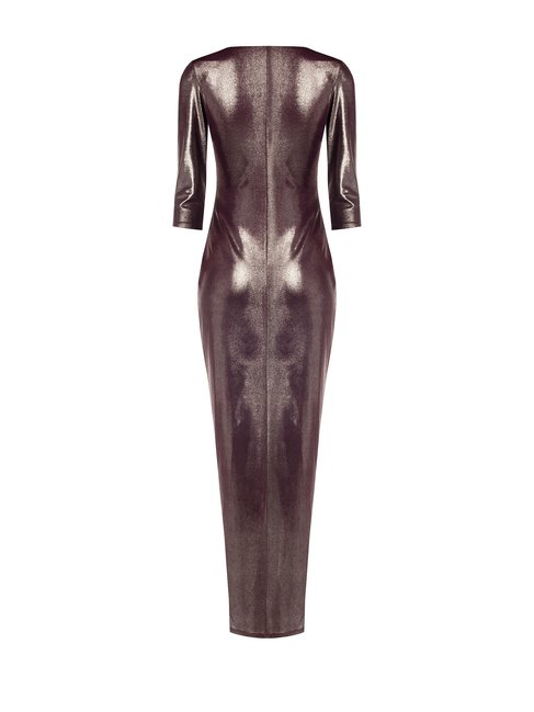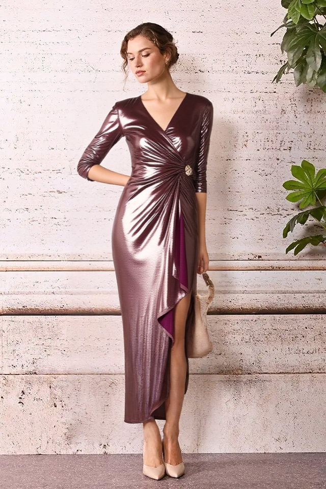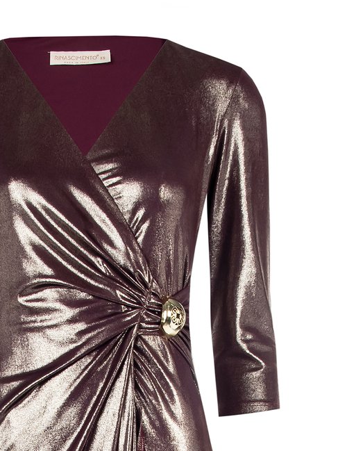 Extravagantné spoločenské šaty z kolekcie talianskej módnej značky Rinascimento sú štýlovým modelom zvýrazňujúcim siluetu postavy a jej ženskosť. Šaty sú vyrobené z kvalitného, pružného, prispôsobivého materiálu, majú bordó farebný základ pretkávaný zlatom s metalickými odleskami, úzky, prekladaný, asymetrický strih s vysokým rozparkom a riasením predného dielu, podšitie, 3/4 rukáv a vkusný detail v podobe brošne s logom značky v páse.