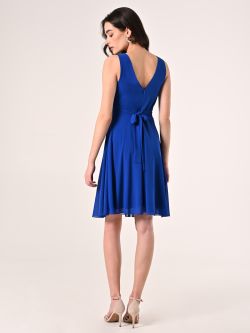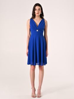 Krátke koktailové šaty z aktuálnej kolekcie talianskej módnej značky Rinascimento sa vyznačujú eleganciou a štýlom. Šaty sú ušité z kvalitného materiálu v kráľovskej – modrej farbe, majú veľmi pekný strih so skladaním v dekolte, širokú pásovku so zadným viazaním na stuhu, bohatý kruhový sukňový diel a odnímateľnú brošňu s kamienkami.