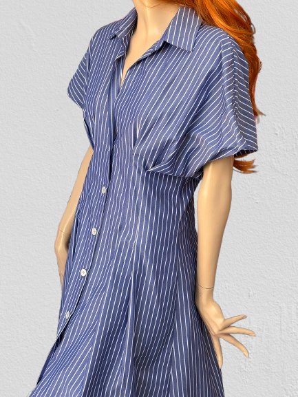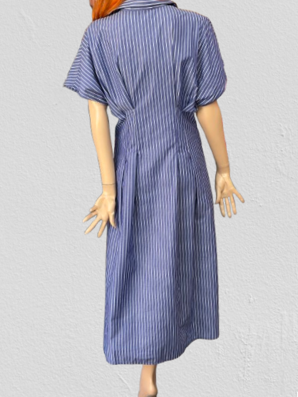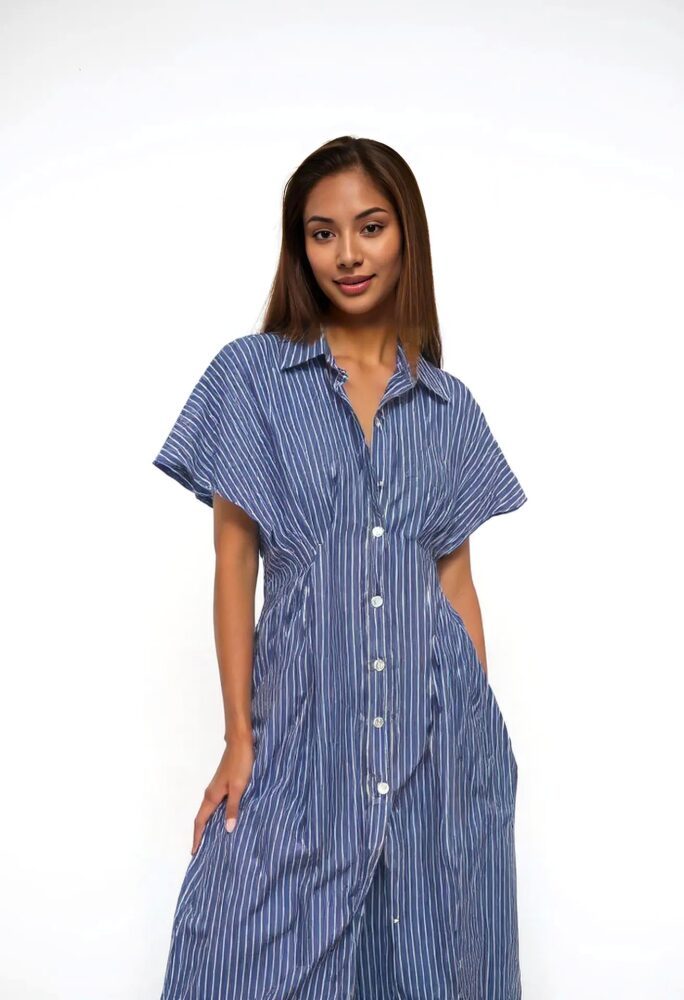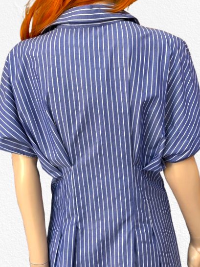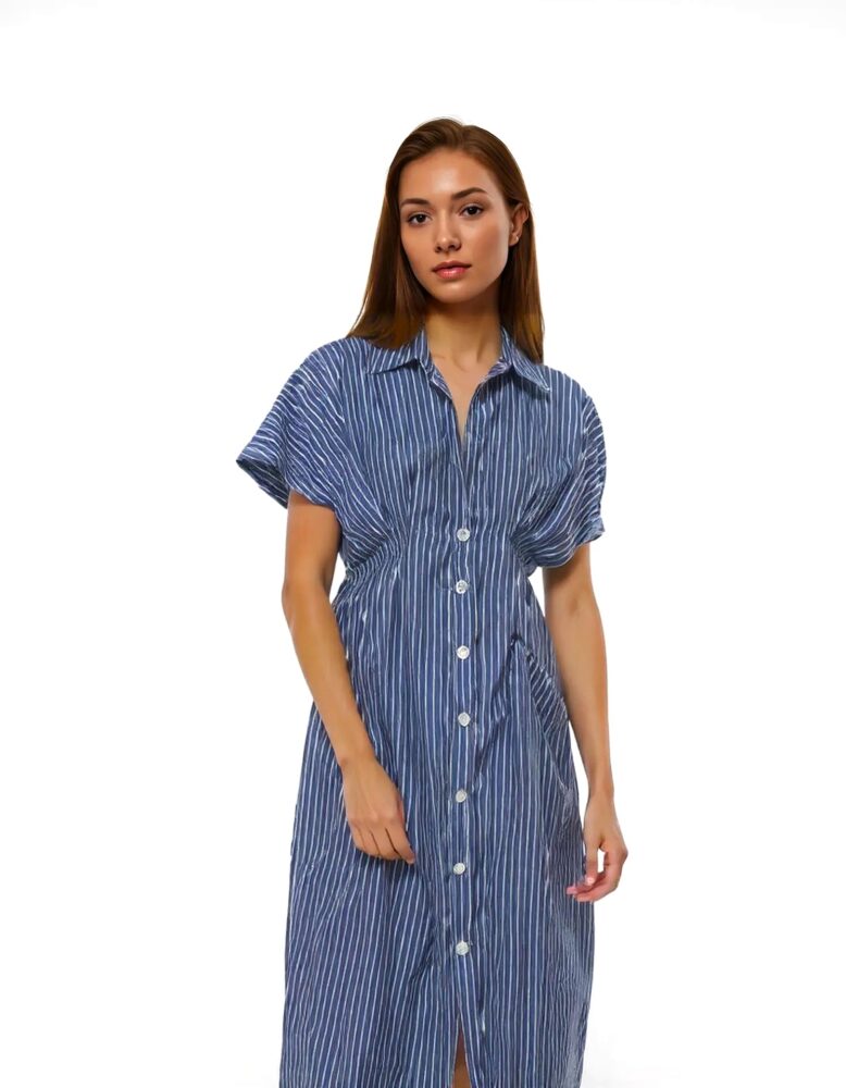 Košeľové šaty z aktuálnej letnej kolekcie talianskej módnej značky Rinascimento sú športovo – elegantným modelom vhodným na denné nosenie. Šaty sú ušité z ľahkého bavlneného materiálu, majú veľmi pekný strih so zvýrazneným pásom, zapínanie na gombíky, golier, raglanový rukáv, lady dĺžku a príjemný modrý farebný základ so vzorom jemných bielych prúžkov.
