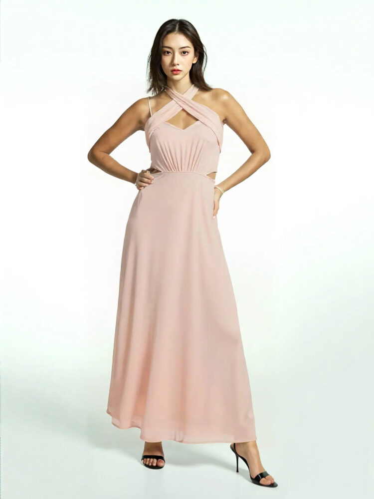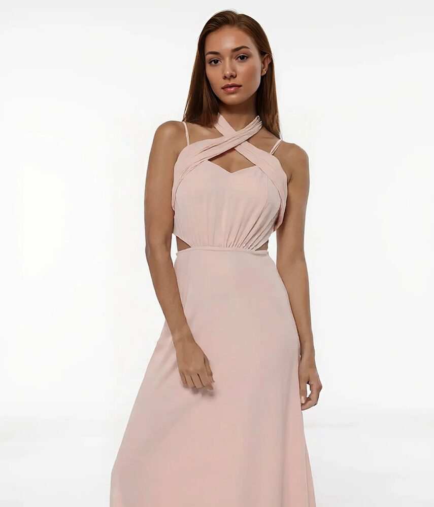 Luxusné spoločenské šaty z kolekcie talianskej módnej značky Rinascimento sú nápaditým a štýlovým modelom v jemnom, marhuľovom farebnom odtieni. Šaty majú veľmi pekné šitie so zaujímavými prvkami – šálové zapínanie okolo krku, výškovo nastaviteľné ramienka a bočné prestrihy s telovým, tylovým vsadením, ľahký, padavý materiál a podšitie. Jedinečný kúsok vhodný na akúkoľvek spoločenskú udalosť.