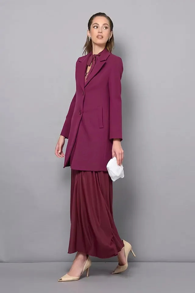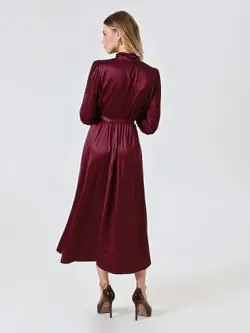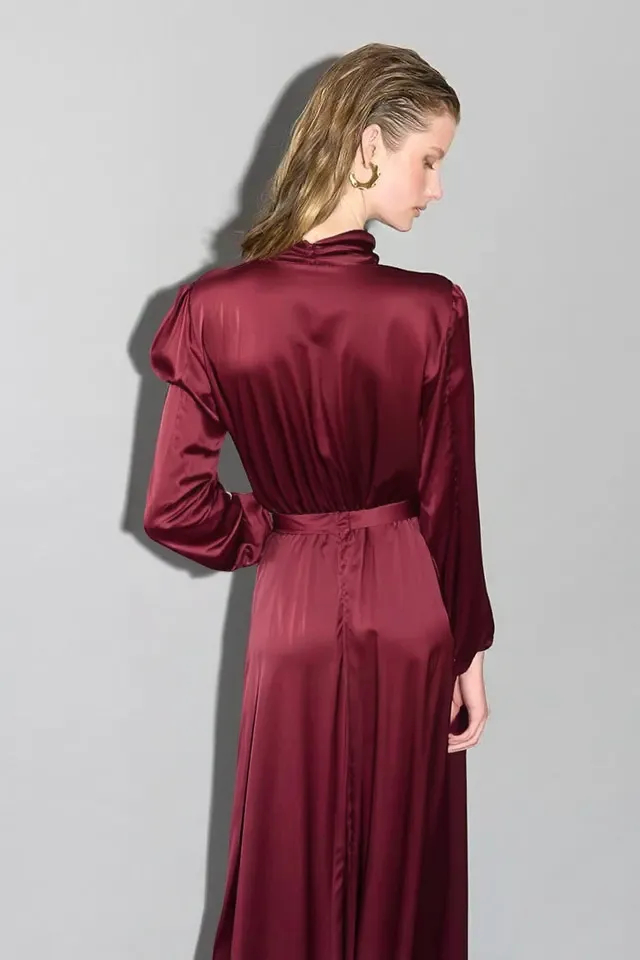 Dlhé šaty z aktuálnej kolekcie talianskej módnej značky Rinascimento sú veľmi pekným elegantným modelom v nádhernej baklažánovo bordovej farbe. Šatu sú ušité z príjemného, mierne lesklého materiálu, majú prekladaný dekolt s viazaním na krku, zadnú pružnú pásovku s opaskom na ktorom je logo značky, riasený rukáv ukončený manžetou a princezkový strih s bočným rozparkom na ľavej strane.