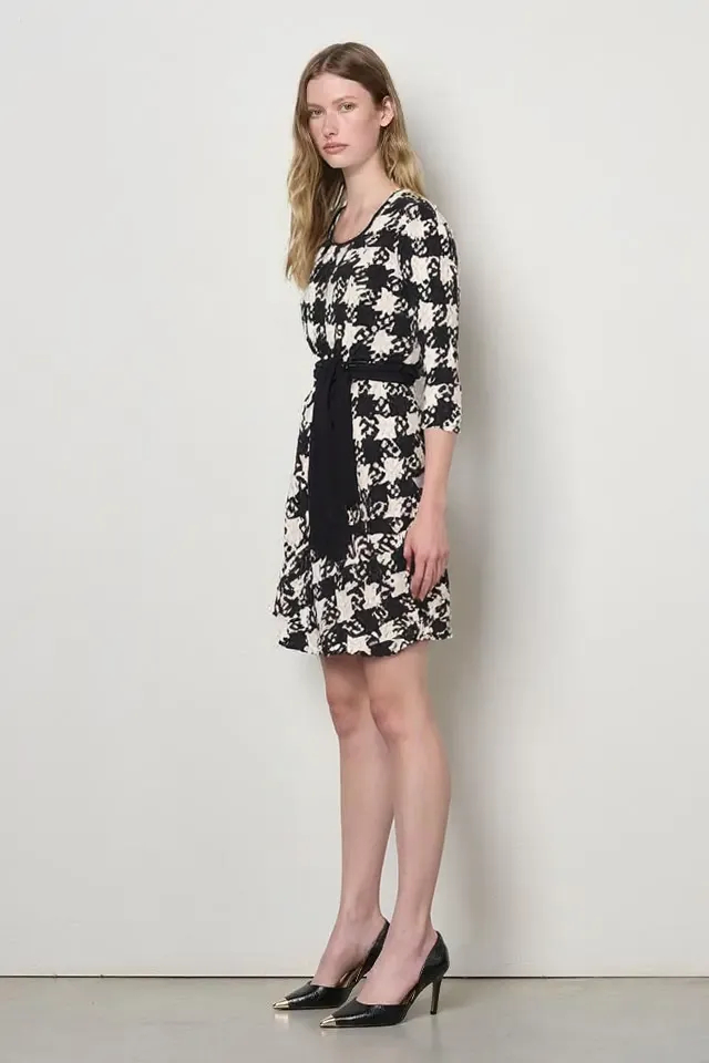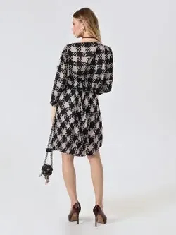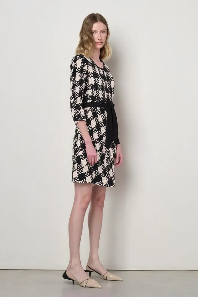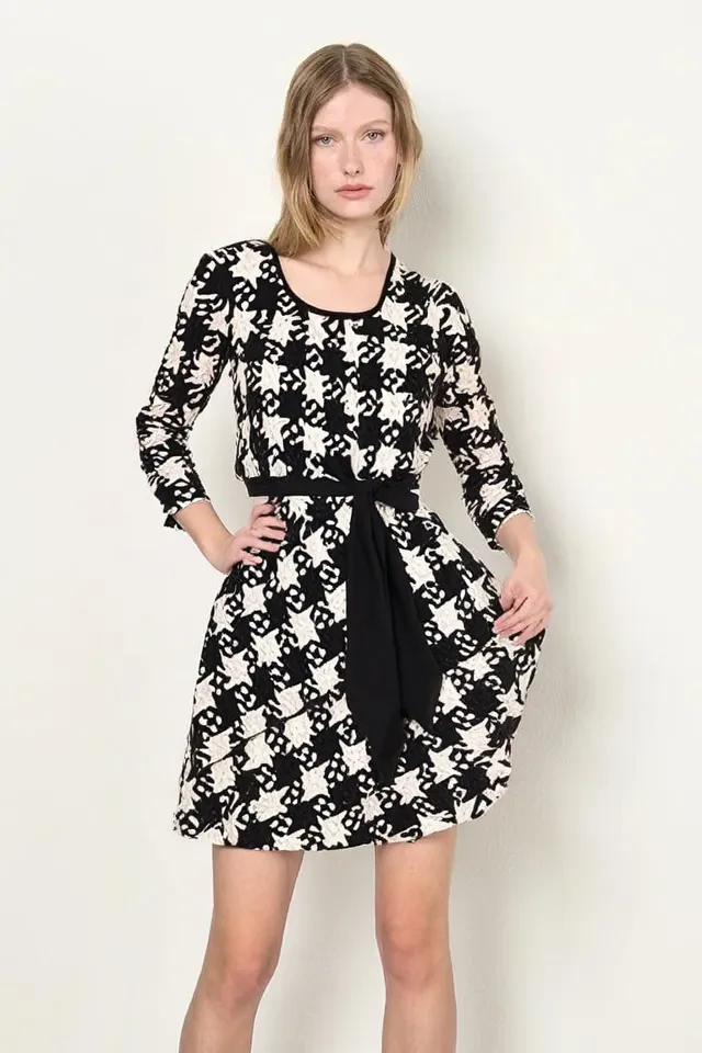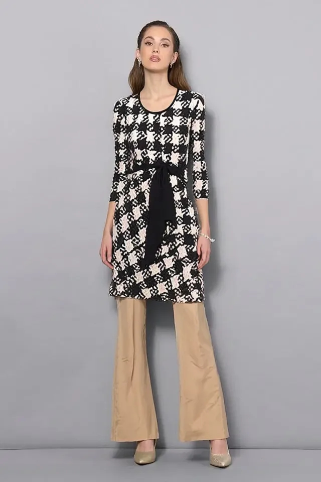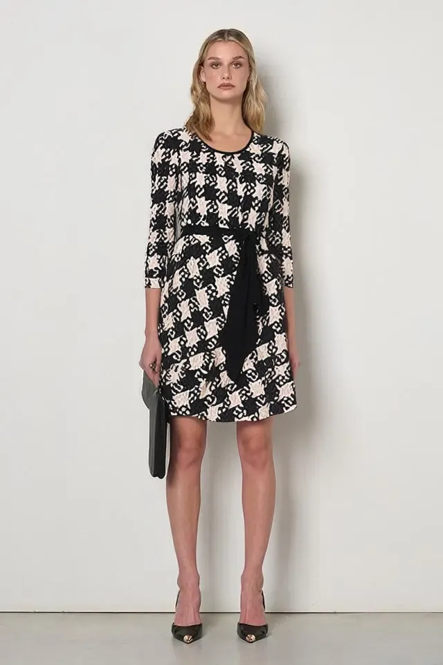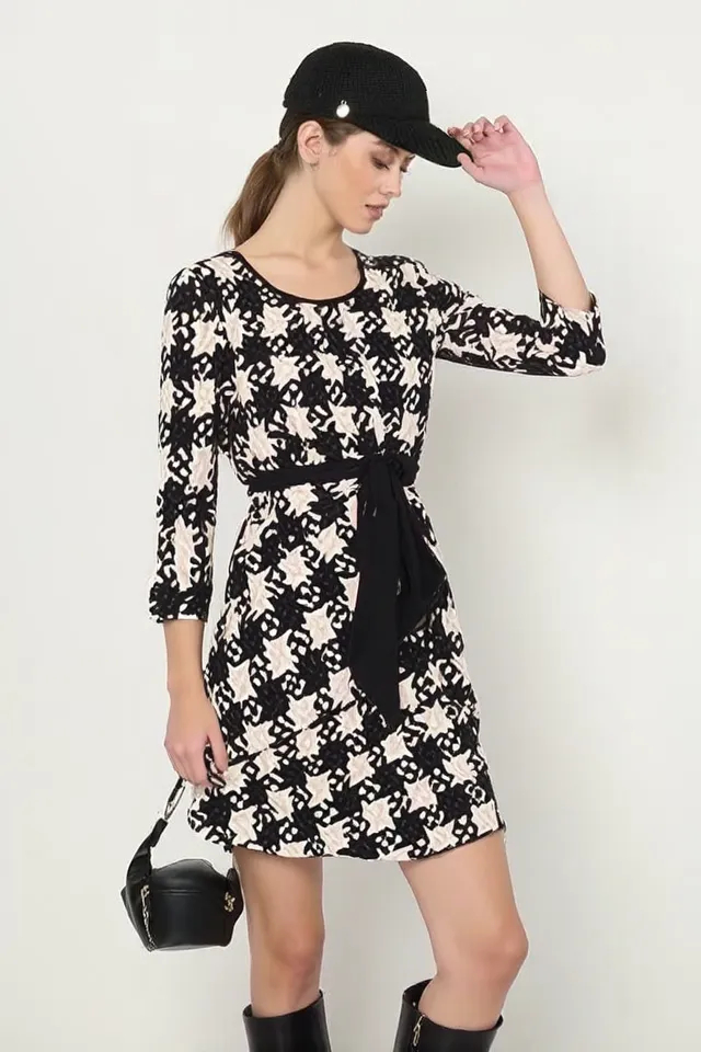 Milé šaty z aktuálnej kolekcie talianskej módnej značky Rinascimento sú nadčasovým modelom vhodným na elegantné denné nosenie. Šaty majú príjemnú farebnú kombináciu čiernej, bielej a béžovej, skvelý padavý materiál, zaujímavý akoby puzzle vzor, pružnú pásovku s ozdobnou mašľou na prednej časti a 3/4 rukáv ukončený stiahnutím do gumičky.