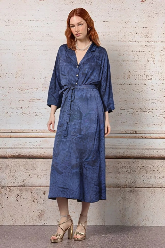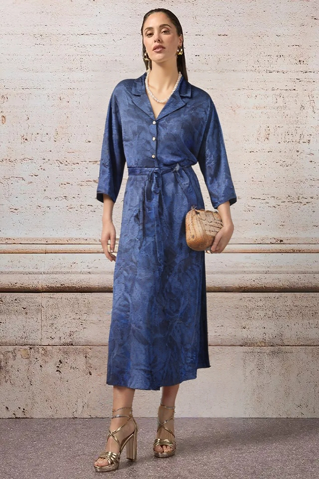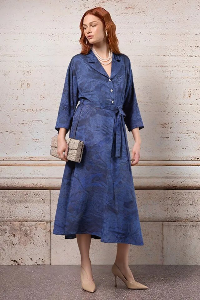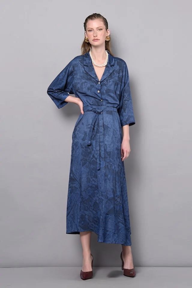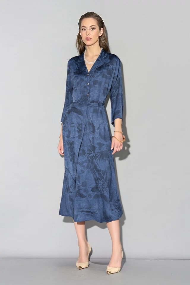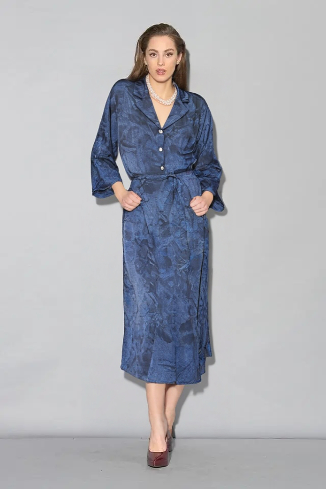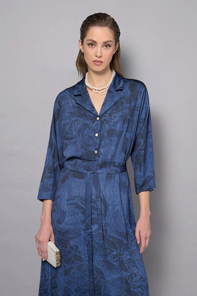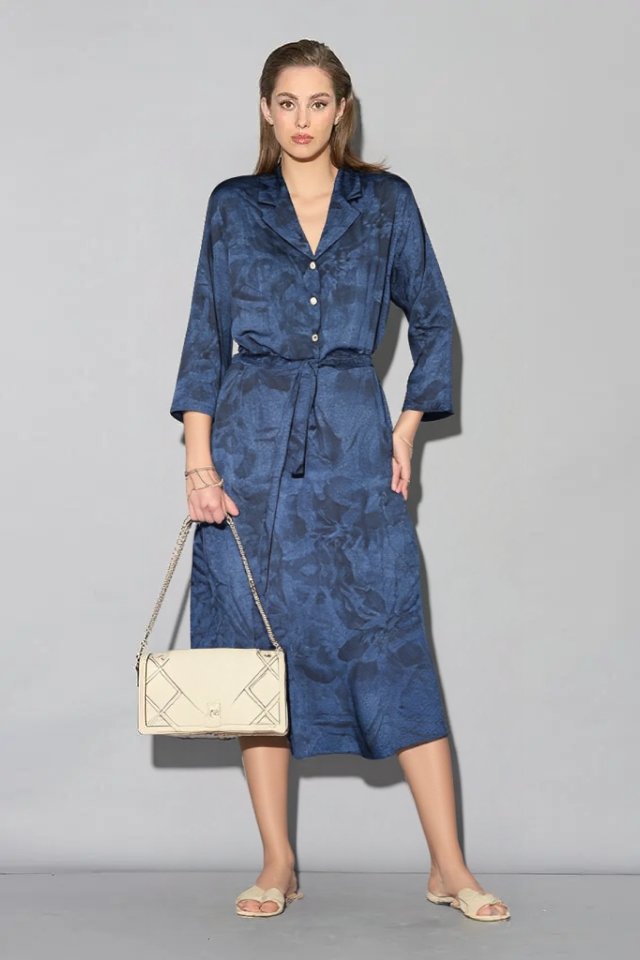 Vkusné košeľové šaty z kolekcie talianskej módnej značky Rinascimento sú športovo – elegantným modelom vhodným na pohodlné denné nosenie. Sú vyrobené z kvalitného, ľahkého, splývavého materiálu v čierno – modrej farebnej kombinácii s abstraktným vzorom kvetov. Šaty majú princes strih s opaskom a bočným zapínaním na zips pre jednoduché obliekanie, sakovú fazónku s golierom a zapínaním na zlaté gombíky s logom značky a 3/4 rukáv.