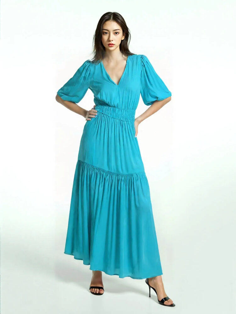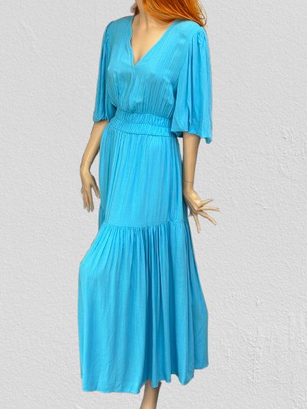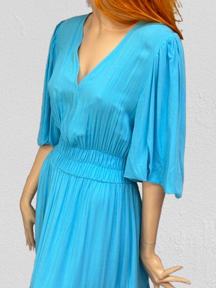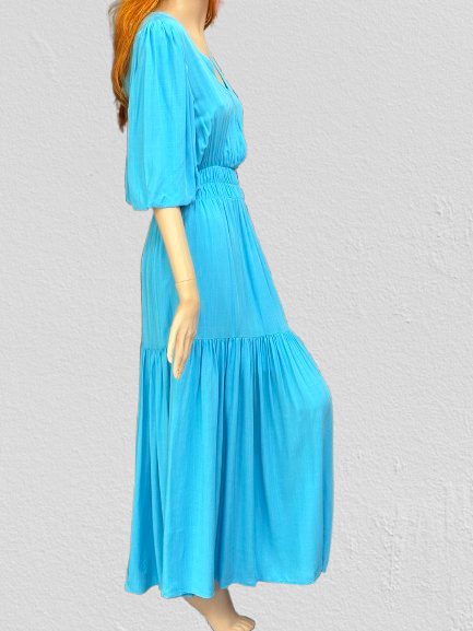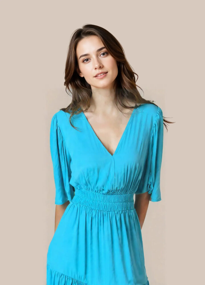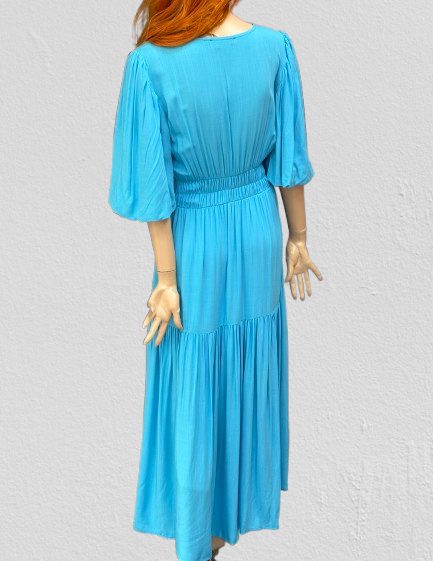 Letné šaty z kolekcie talianskej módnej značky Rinascimento v žiarivom tyrkysom farebnom odtieni sú modelom vhodným na pohodlné denné nosenie. Šaty sú ušité z príjemnej viskózy, majú podšitie, širokú pružnú pásovku, bohatý volánový sukňový diel a riasený mierne pufkový krátky rukáv.