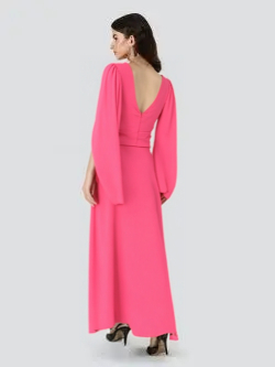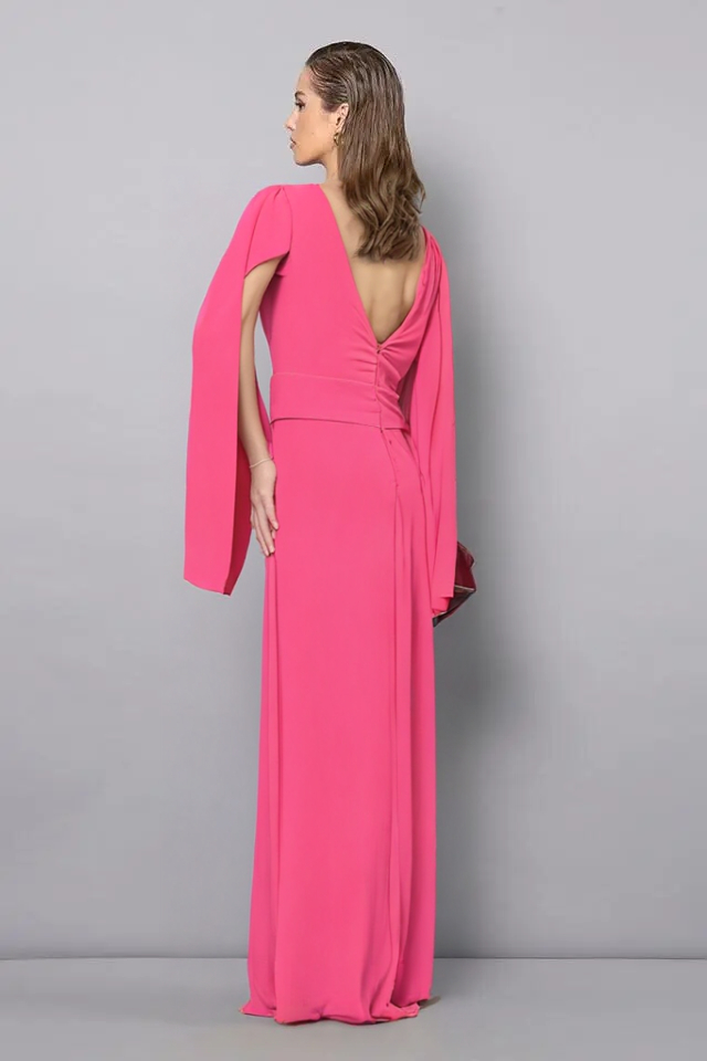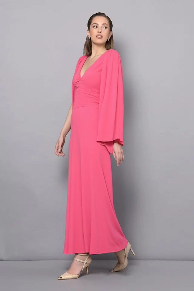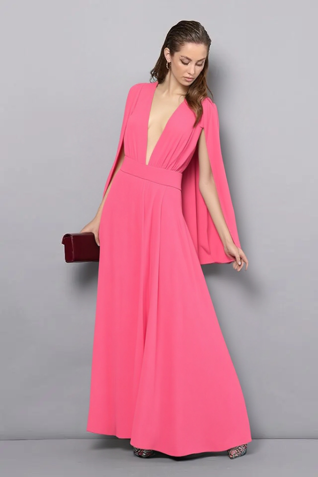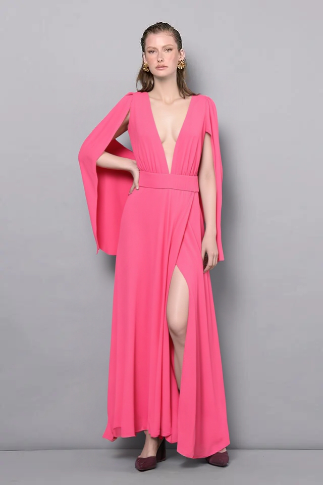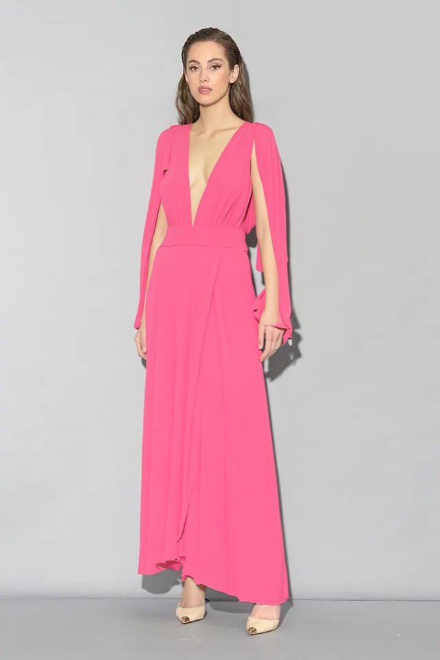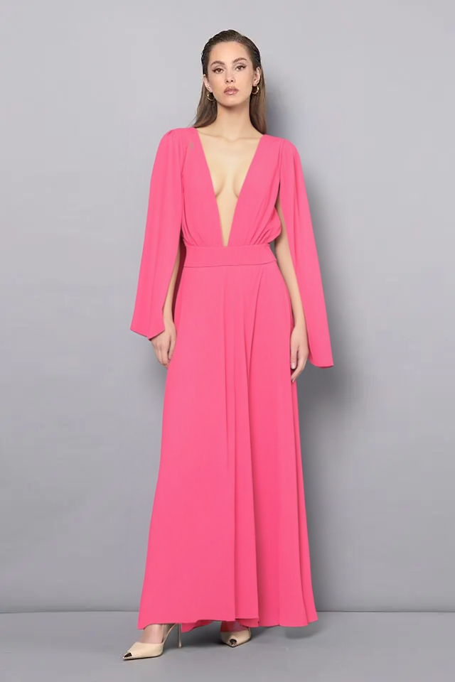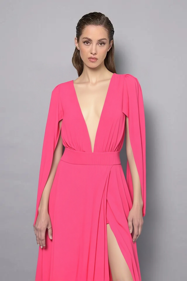 Spoločenské šaty z kolekcie talianskej módnej značky Rinascimento sú modelom, ktorý má jednoduchý princess strih s hladkými líniami zvýrazňujúcimi ženskú siluetu a príjemne viditeľný lososový ružový farebný odtieň. Šaty sú vyrobené z kvalitných materiálov s perfektným vypracovaním, majú podšitie, vysoký predný rozparok, širokú pásovku, hlboký výstrih v dekolte spojený neviditeľným tylom v telovej farbe, zadné zapínanie na zips a dielové rukávy, ktoré je možné nechať splývať voľne, alebo uviazať ako mašľu okolo ruky.