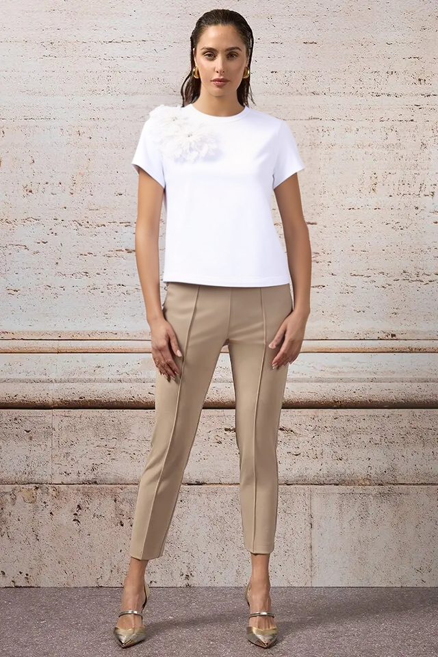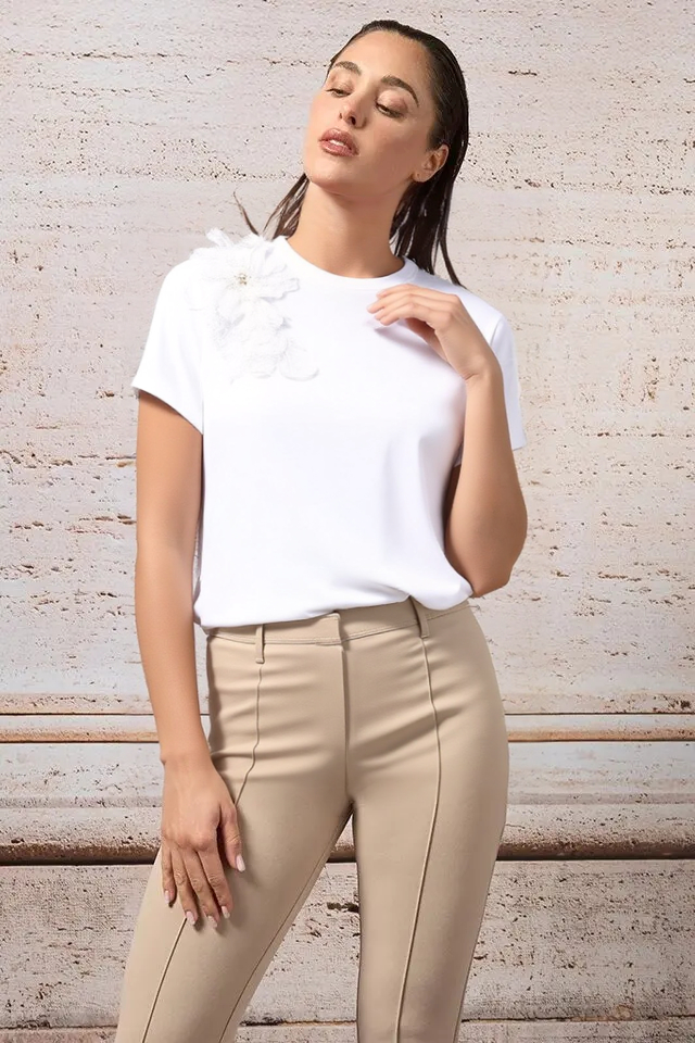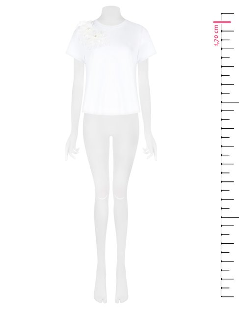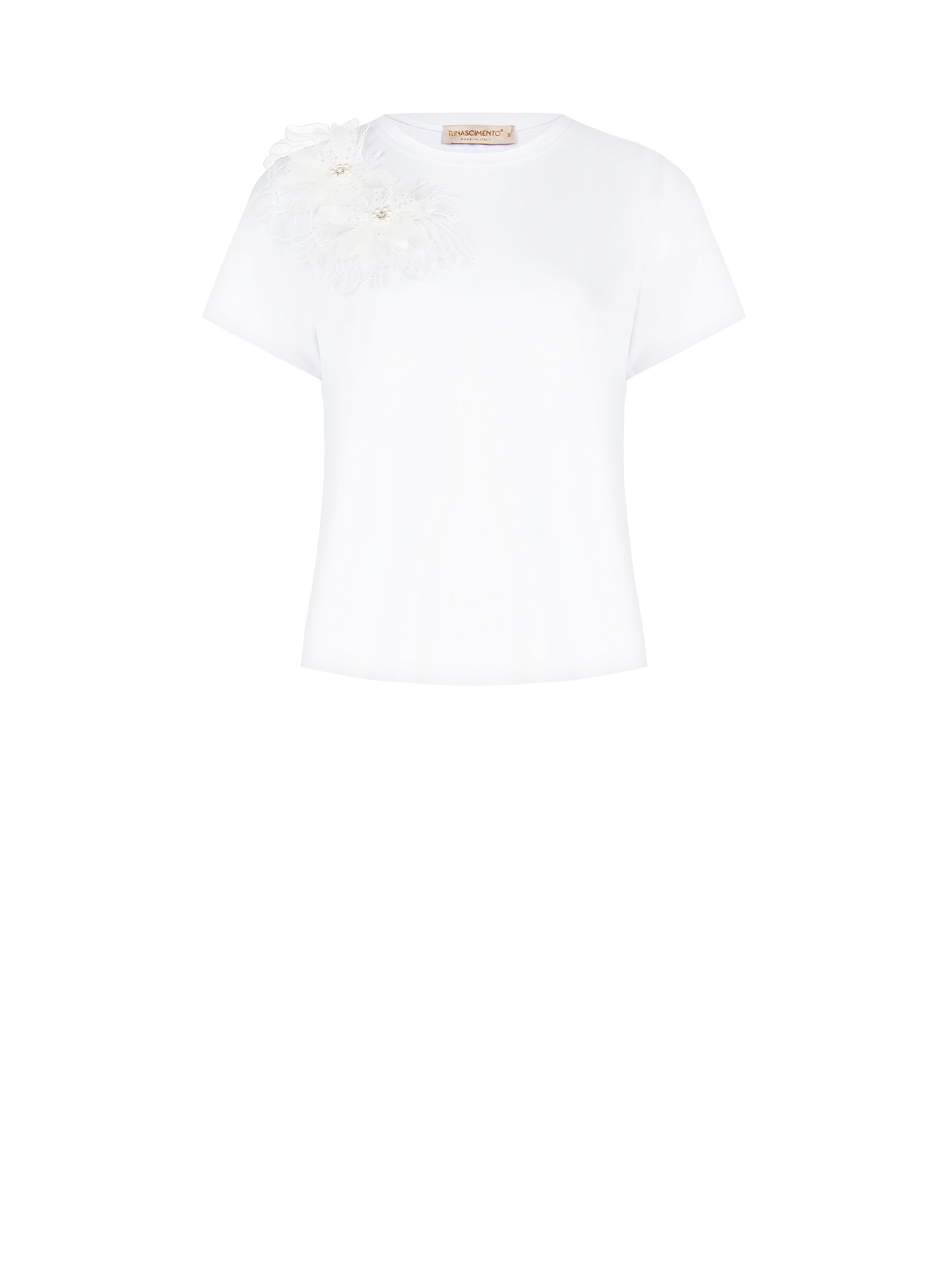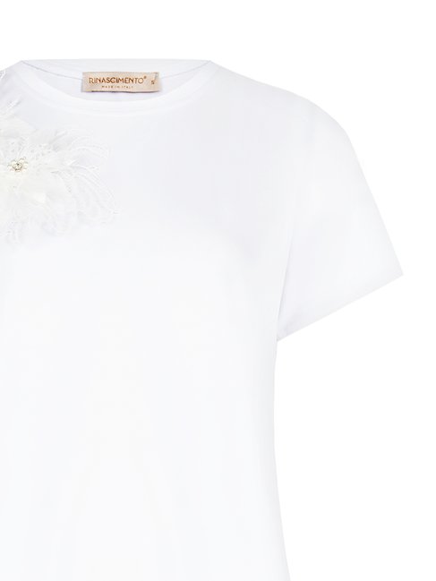 Eleganciu jednoduchosti vyjadrujú štylizované kvety vyrobené z čipky, tylu, pierok, perličiek a kamienkov. Toto biele tričko je nevyhnutnou súčasťou každodenného šatníka, interpretované s moderným, umeleckým nádychom.