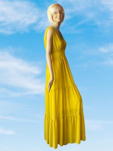 Úžasný model letných šiat vhodných aj na slávnostné príležitosti v nádhernej slnečnicovo – žltej farbe z kolekcie šiat luxusnej talianskej značky Rinascimento. Šaty majú padavý, vzdušný materiál, veľmi pekný strih s bohatou volánovou sukňovou časťou, prestrih pod prsiami a zadné zapínanie na zips.