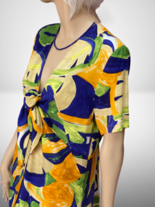 Pestré letné šaty z aktuálnej kolekcie talianskej módnej značky Rinascimento sú modelom vhodným na denné nosenie k sandálom, aj teniskám. Šaty sú ušité z príjemného vzdušného materiálu, majú voľný strih so zapínaním na gombíky a viazaním na mašľu v dekolte. Milý kúsok ktorý je kombinovateľný na nosenie k nohaviciam ako predĺžená košeľa, alebo samostatne ako krátke šaty.