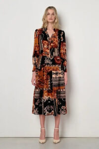 Šaty na denné nosenie v aktuálnych farebných tónoch z kolekcie talianskej módnej značky Rinascimento sú modelom vhodným na denné nosenie. Šaty majú pohodlný strih bez prestrihu pásovky, podšitý spodný diel z volánov, príjemný žoržetový materiál, bočné zapínanie na zips, rukávy ukončené riasenou manžetou a košeľový golier so zlatou odnímateľnou retiazkou ukončenou strapcami.
