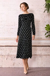 Šaty z aktuálnej kolekcie talianskej módnej značky Rinascimento sú roztomilým modelom vhodným na elegantné denné nosenie, ktorý sa vyznačuje kvalitou šitia a splývavého materiálu s romantickým a nadčasovým vzorom bielych bodiek na čiernom farebnom základe. Šaty majú princes strih s vyššou širokou pásovkou, ktorá je v zadnej časti pružná, okrúhly výstrih pri krku s riasením, ktoré je aj na rukávoch ukončených manžetou a zadné zapínanie na zips a malé gombíky v zlatej farbe, ktoré zapínajú aj manžetu rukávov.