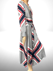 Veľmi pekné elegantné šaty ušité v tunikovom štýle sú modelom z limitovanej kolekcie šiat, talianskej módnej značky Rinascimento. Šaty majú pudrový farebný základ s písaným vzorom, voľný rozšírený strih, prijemný materiál a ich elegantnosť podtrhuje kravata na krku. Je možné nosiť ich aj ako predĺženú tuniku k nohaviciam.