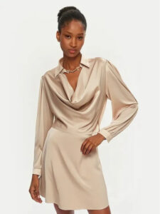 štýlové kokteilové šaty z kolekcie talianskej módnej značky Rinascimento v zlatistom svetlom farebnom odtieni, sú modelom vhodným na nosenie pri menších slávnostných udalostiach a posedeniach. Šaty majú princezkový strih so zadnou pružnou pásovkou, riasené rukávy ukončené manžetou, vodopádový dekolt s golierikom a zlatou ozdobnou rozopínateľnou sponou.