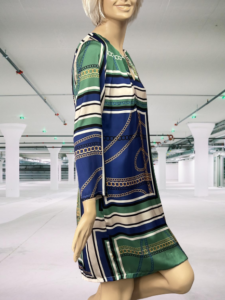 Šaty tunikového strihu a veľmi peknej farebnej kombinácii, sú modelom z aktuálnej kolekcie šiat luxusnej talianskej značky Rinascimento. Šaty majú príjemný, jemný materiál, pútavý vzor, 3/4 rukáv a zaujímavo riešený dekolt – prekladané riasenie látky a ozdoba v podobe umelej retiazky v zlatom farebnom odtieni. Kúsok ktorý je možné nosiť samostatne k čižmám, lodičkám, alebo ako predĺženú elegantnú blúzku k jednofarebným nohaviciam.